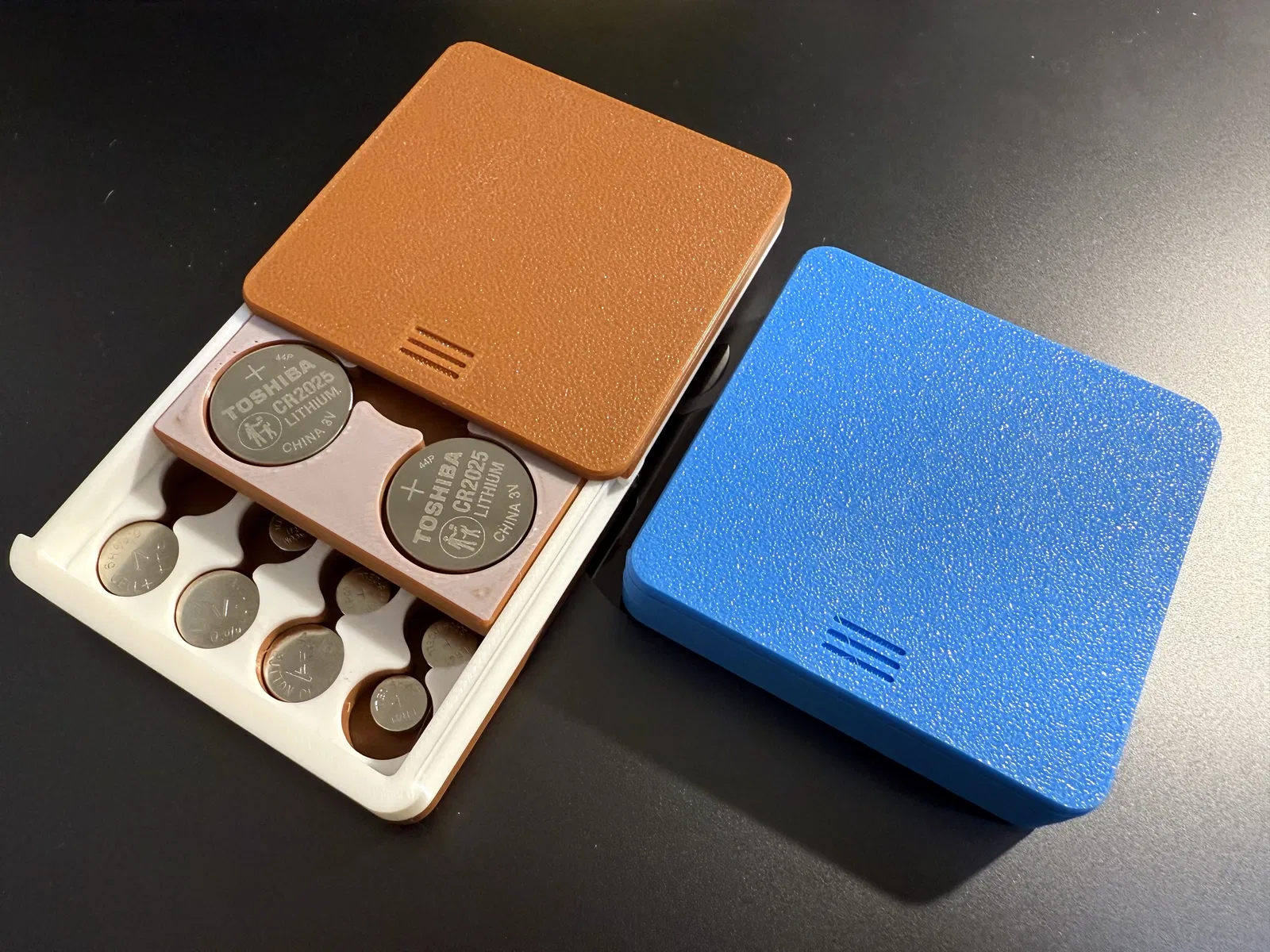 Hộp đựng pin coin cell/button battery dạng slide box, dễ cất gọn và tránh chập mạch. Hỗ trợ CR2450/CR2032/LR44 và cả các pin nhỏ hơn như CR2016/CR2025/CR1632/AG10/LR41.