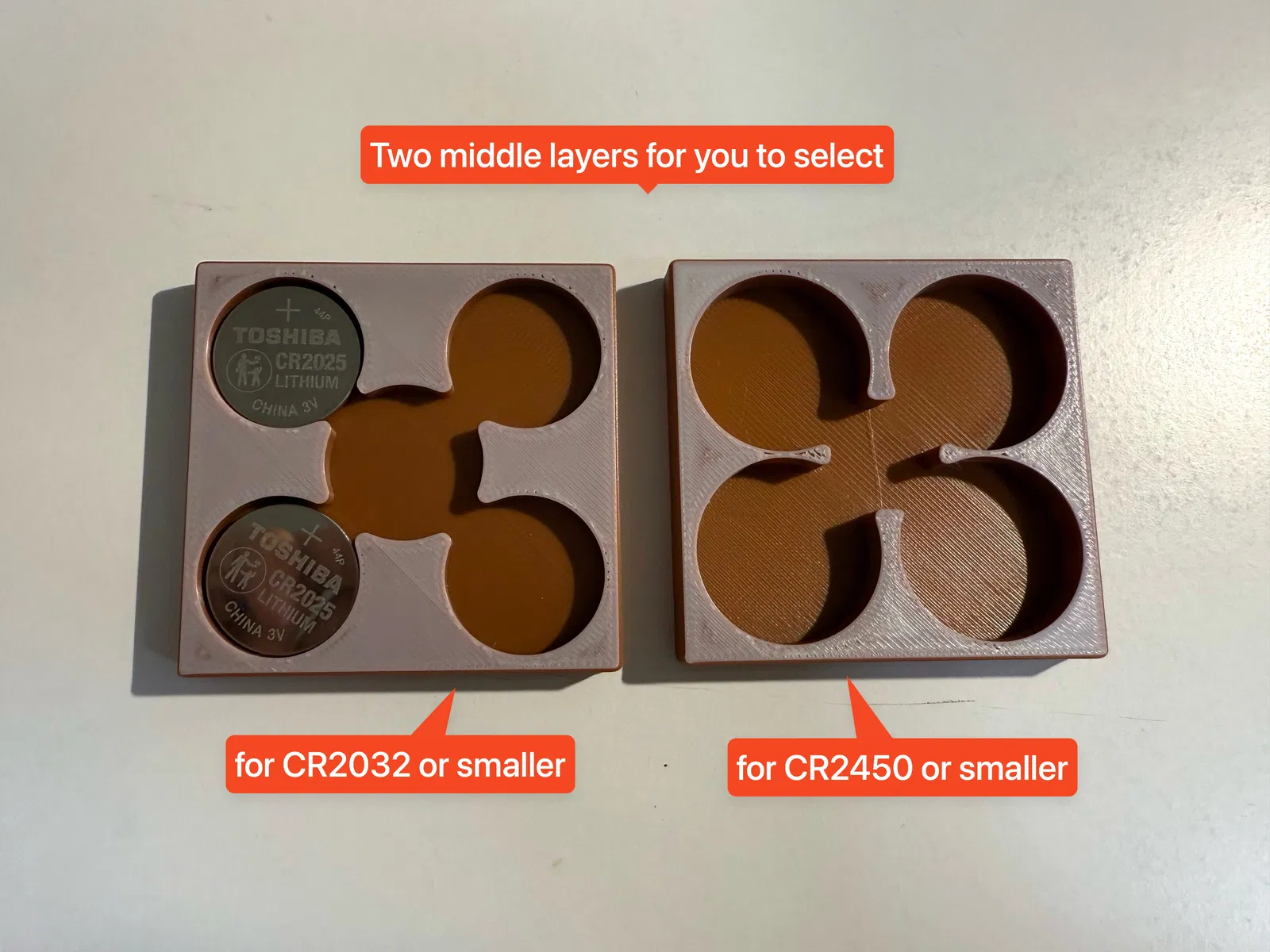 Các ngăn được thiết kế để vừa CR2032, CR2450 (tùy bạn chọn lớp giữa nào), và LR44, nhưng cũng dùng tốt cho các loại nhỏ hơn như CR2030 / CR2016 / CR2025 / CR1632 / AG10 / LR41, v.v.