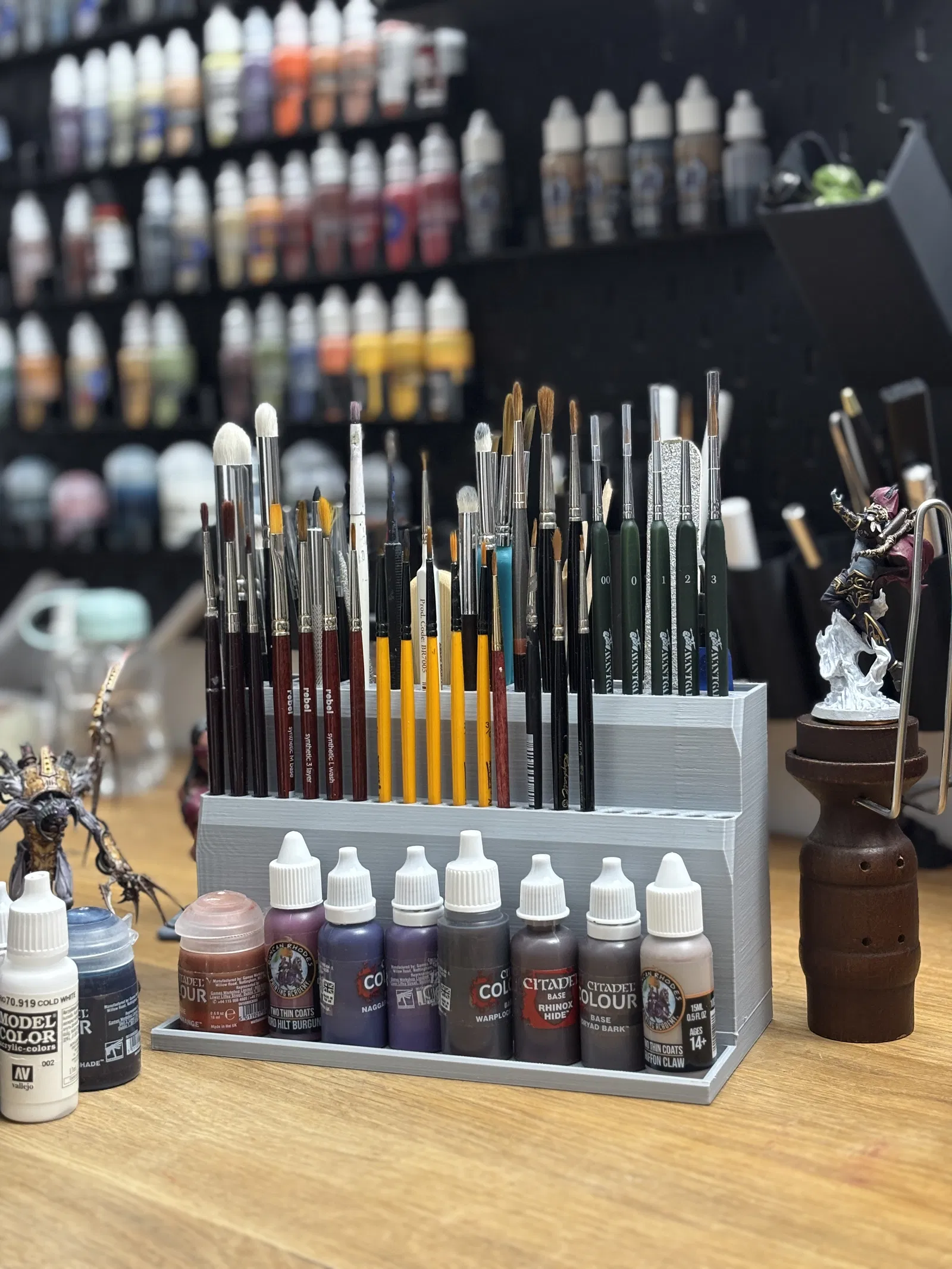 Organizer gọn gàng cho dân sơn miniature: 2 tầng để cọ (21 lỗ 7 mm, 10 lỗ 8 mm, 5 lỗ 10 mm + 1 lỗ lớn), 9 ngăn dụng cụ phía sau và khay trước để 8–10 hũ sơn, vừa Citadel pots lẫn dropper bottles.