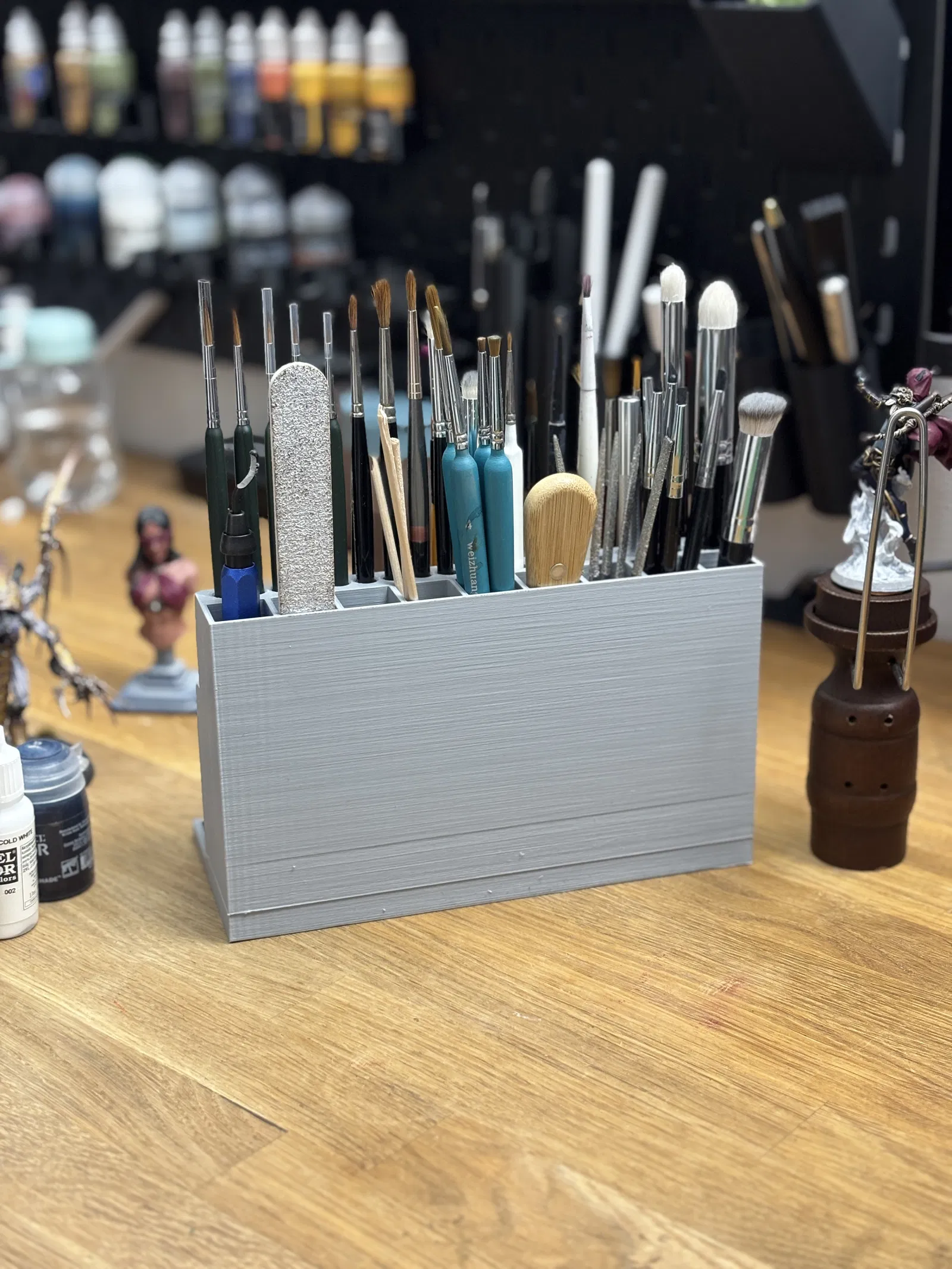 Mình tìm một cái giá đỡ và organizer cho cọ sơn lâu lắm rồi. Mình đã in và test khá nhiều mẫu, nhưng chẳng cái nào trụ trên bàn được lâu. Mẫu này thì cuối cùng cũng đúng cái mình cần — đúng chuẩn thứ mình đang kiếm. Có thể nó không hoàn hảo cho setup của bạn, nhưng mà miễn là bạn thử qua, vậy mới quan trọng!
