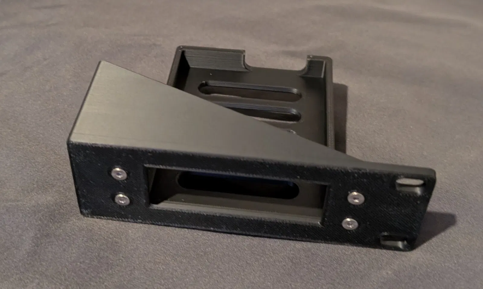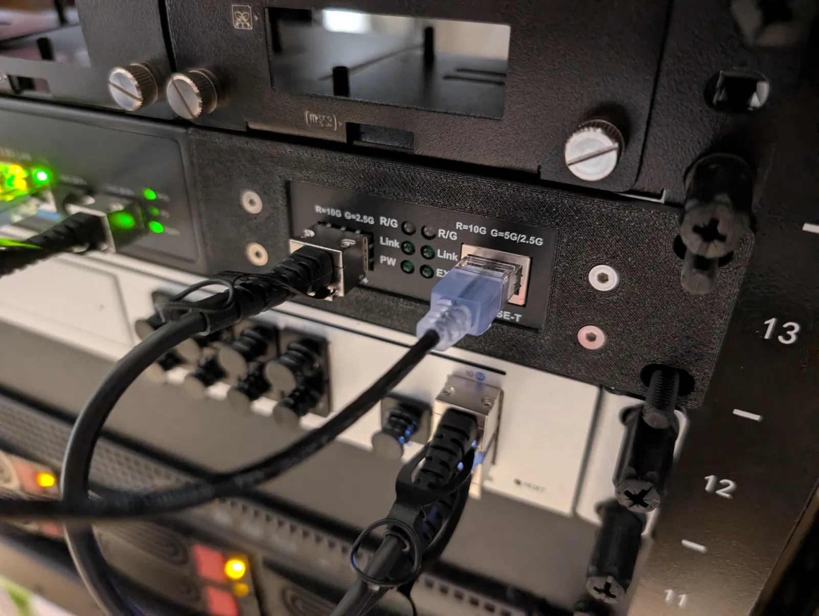 Gắn vừa rack tiêu chuẩn 19", chiếm 1U. Phần ngàm gắn media converter cần Voron-spec heat set inserts, và cần M3 Flat Head bolts để bắt vào switch cũng như cho phần ngàm media converter. (có thể bạn tận dụng lại được vít đi kèm theo NICGIGA switch) Mình dùng vít M3x10 cho phần gắn media converter, và tận dụng lại vít bắt tai đi kèm theo switch để bắt các bracket.