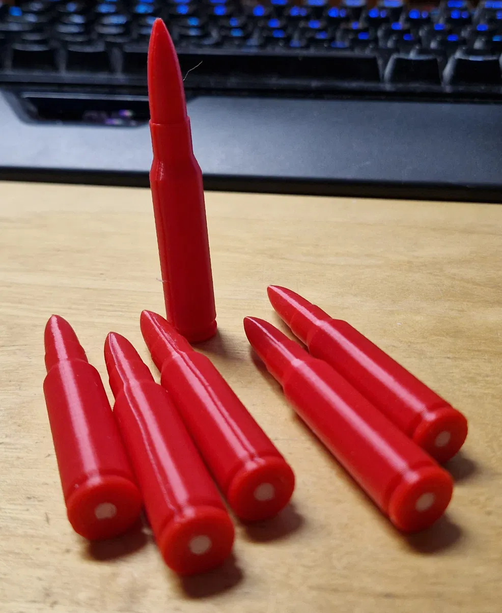 Mô hình snap cap chuẩn .308 Win (7,62×51 NATO) để tập thao tác/kiểm tra, thân in PLA và miếng đệm (buffer insert) in TPU. Thiết kế có lỗ Ø4mm đầu bo tròn nên không cần support, lắp vừa khít.