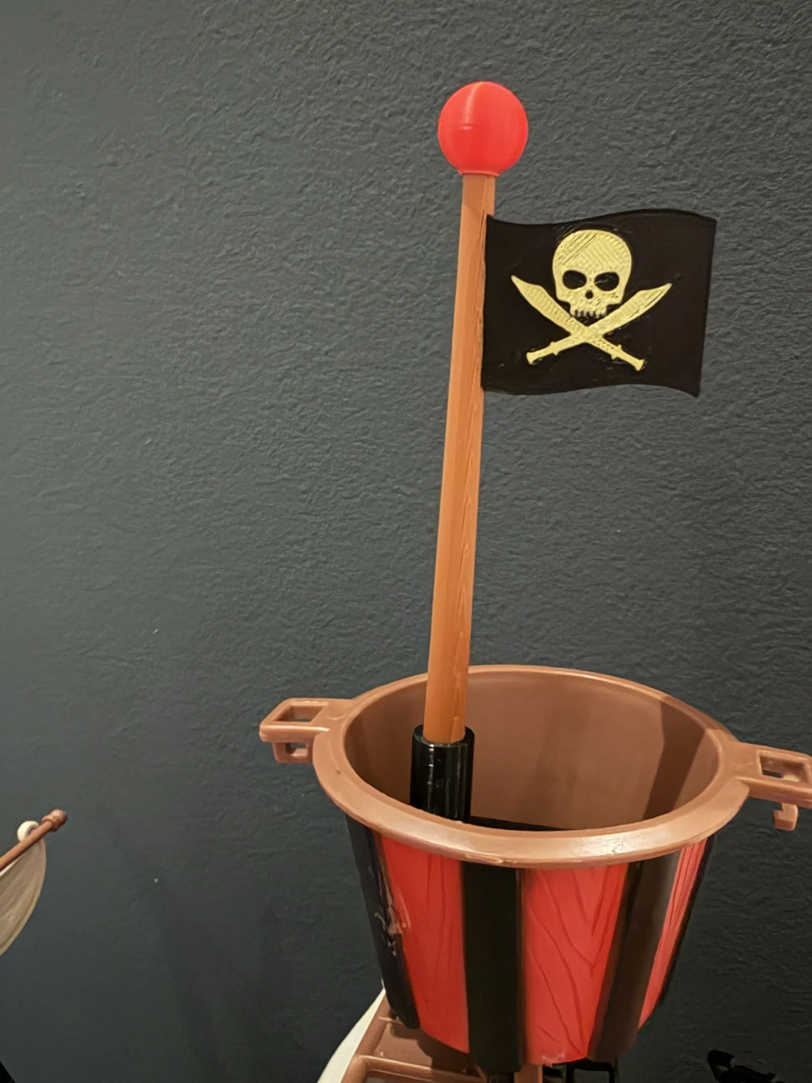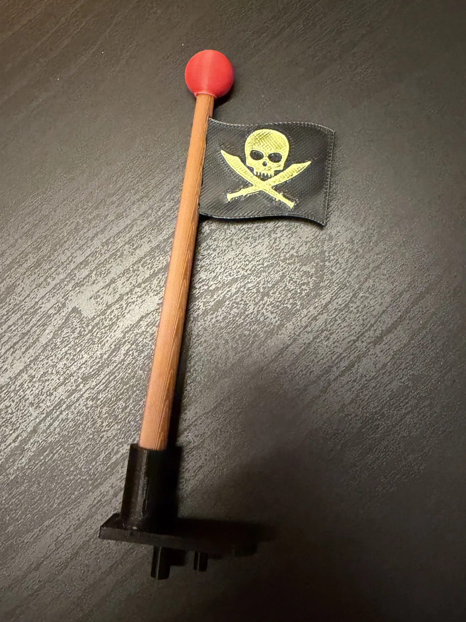 Mẫu cờ Kaptein Sabeltann “Den sorte Dame” dạng lắp ghép nhiều phần, khuyến nghị in theo chế độ print by object rồi dán lại. Gồm ngàm, cột cờ, lá cờ và núm. In 0.20mm, không cần supports.
