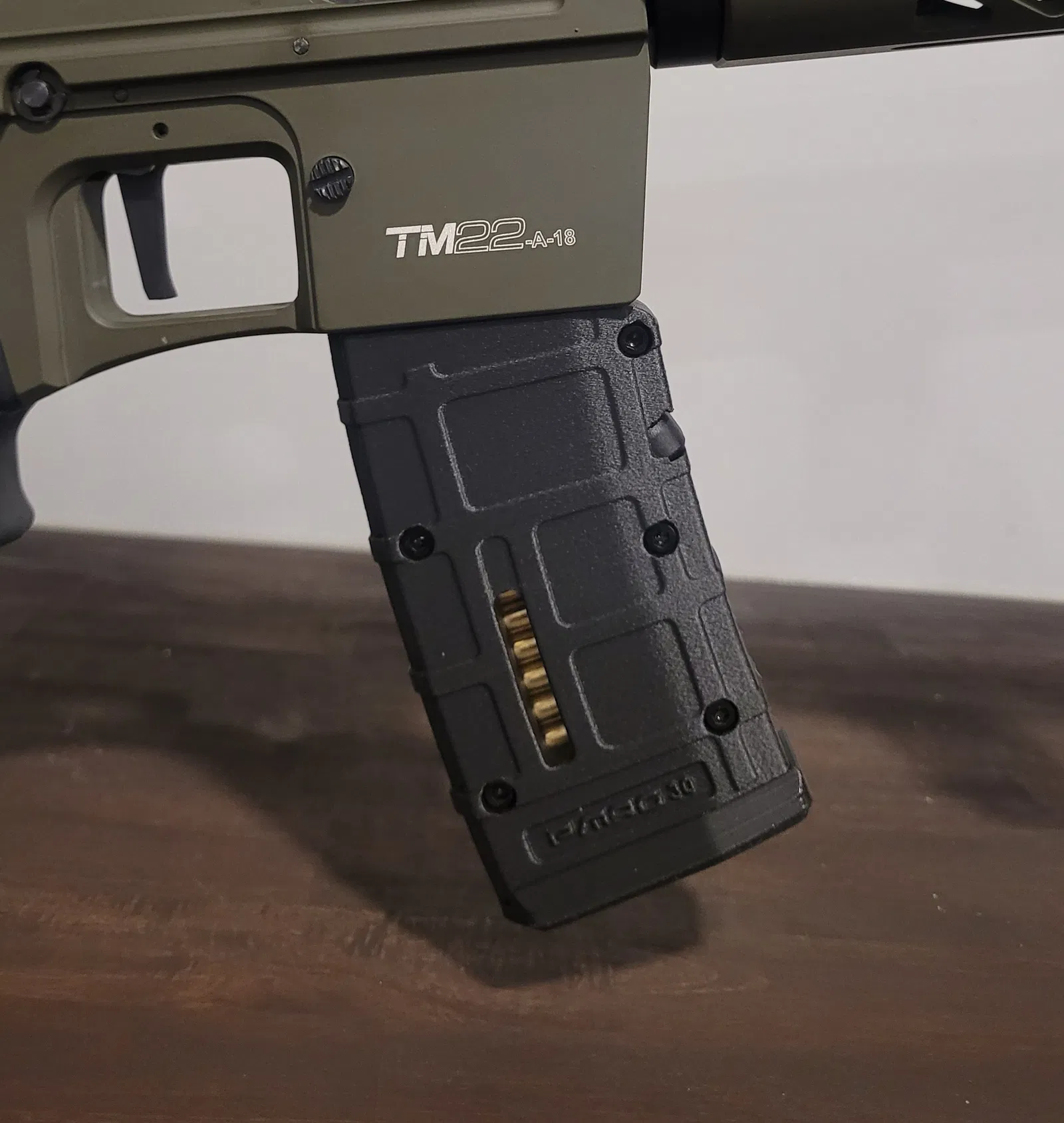 Ốp bọc magazine 3 mảnh lắp bằng bu-lông, chụp vừa magazine polymer 10 viên của Derya TM-22 để có ngoại hình kiểu P-Mag. Có bản có khoét nhét vỏ đạn và bản không khoét.