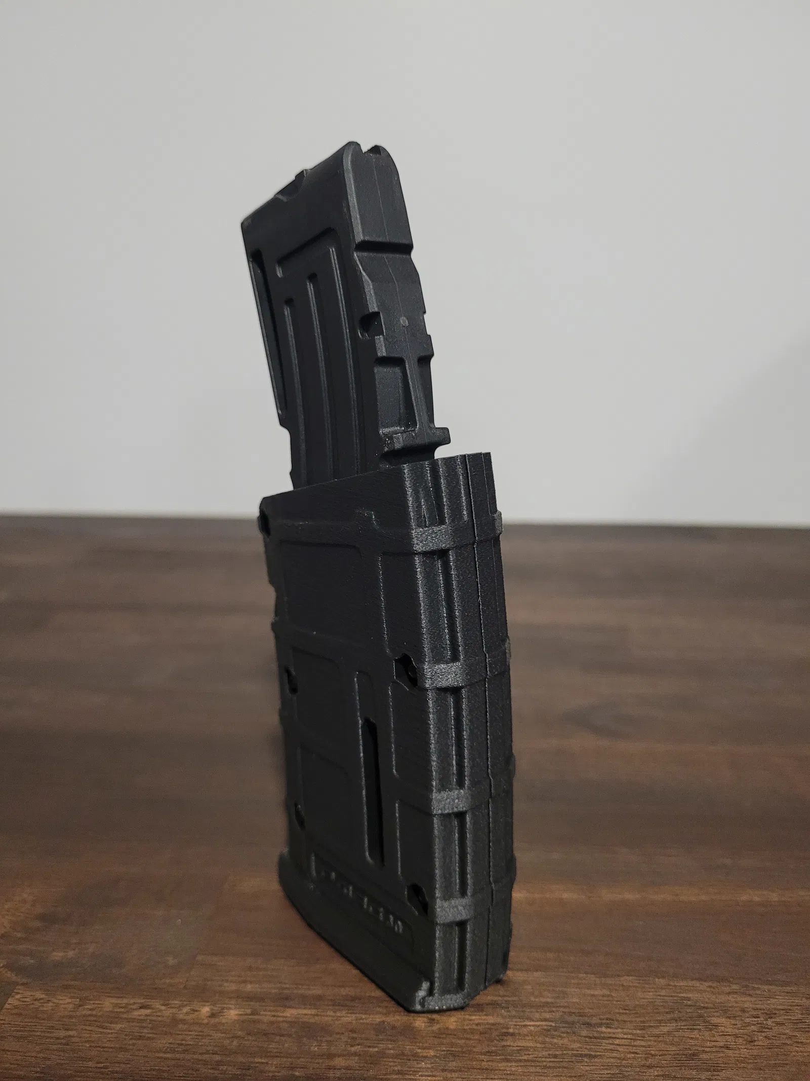 Gắn phần đế. Phần này sẽ rất khít và có thể cần chút ahem “dùng lực cùi chỏ” (gõ lên mặt bàn) để ép nó vào đúng vị trí. Nếu bạn muốn tháo/lắp dễ hơn, có thể chà nhám nhẹ phần loe của các mảnh thân magazine chính. Không dùng fuzzy skin có thể sẽ làm bớt độ khít của mối lắp này, nhưng mình chưa test.