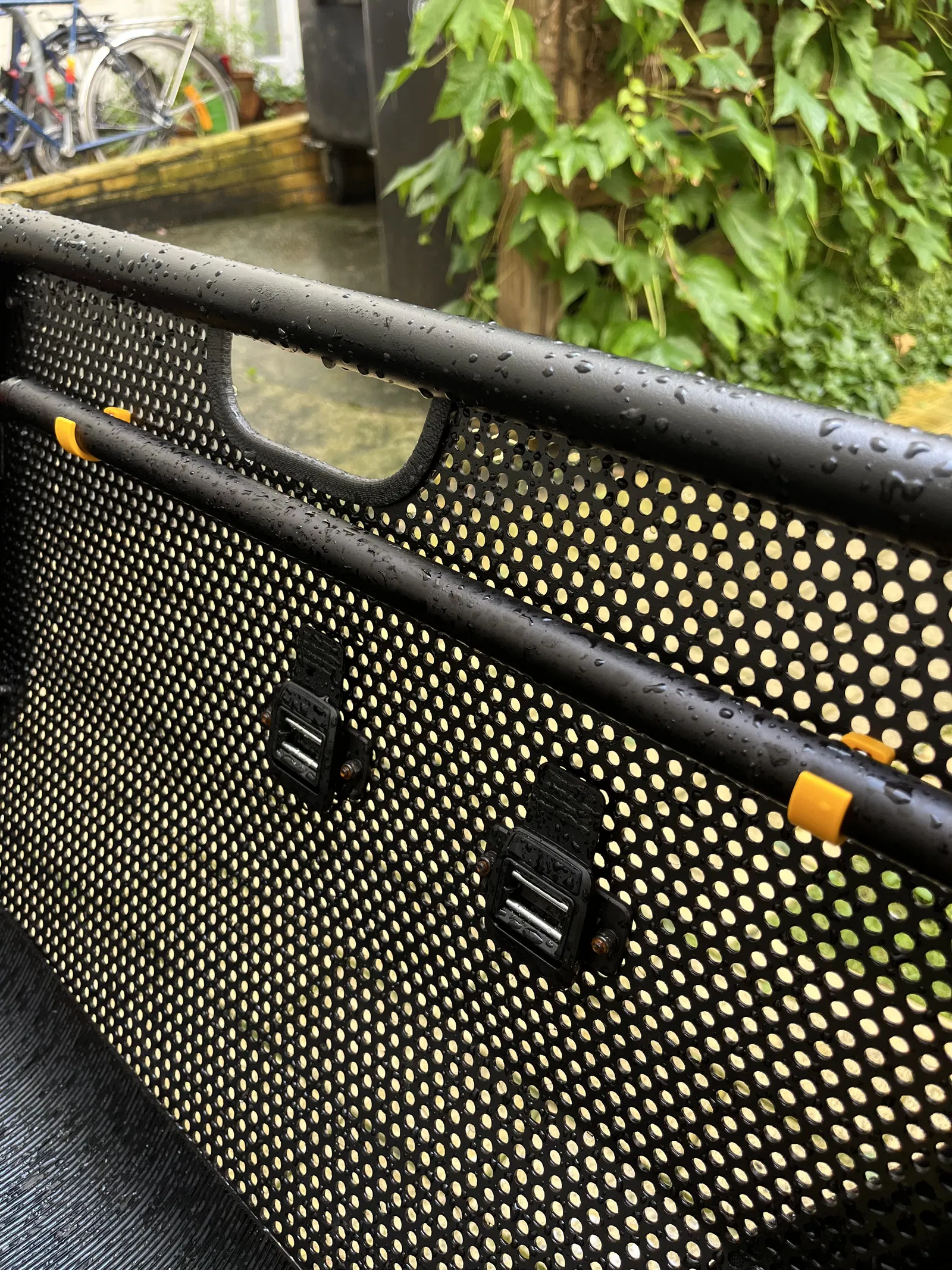 Phụ kiện in 3D giúp giữ các locking rods của giỏ xe muli cargo bike, cố định an toàn vào hai bên giỏ khi không dùng. Chốt dưới chống xoay; khuyến nghị in PETG 100% infill và dùng ốc/vít inox.