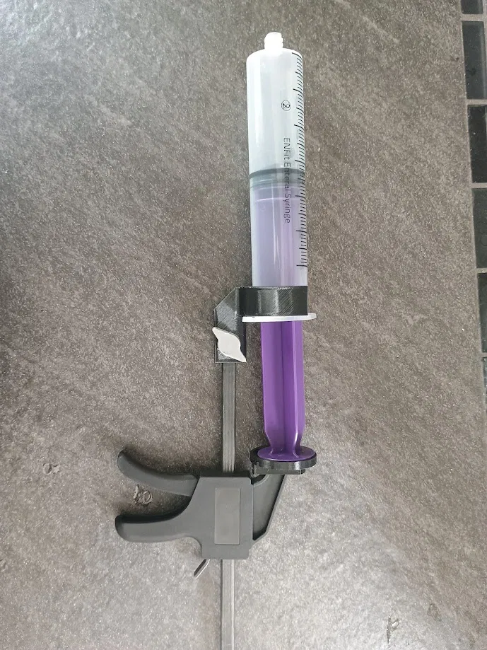 Bộ adapter giúp chuyển kẹp Harbor Freight PITTSBURGH 4 in. Ratcheting Bar Clamp thành 60ml Syringe Assist Tool để đẩy ống tiêm 60 ml. In Jaw xoay đặt lên chamfer, 5 walls để tăng độ bền; lực ~20 lbs, 3 ml mỗi lần bóp.
