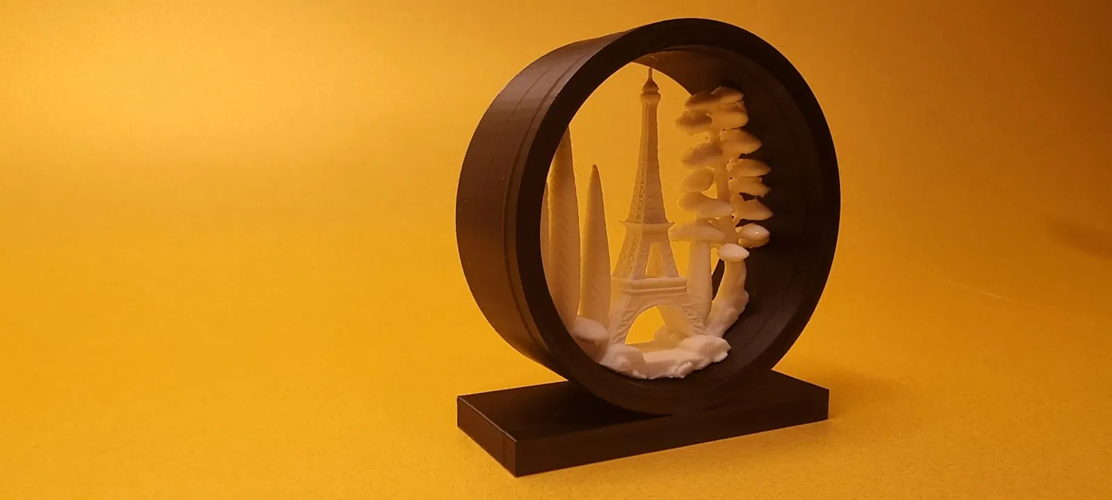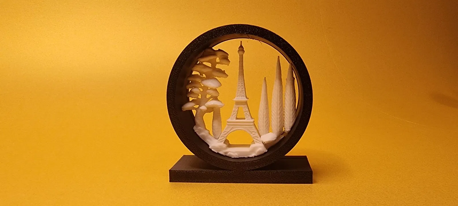 Diorama EIFEL với gợi ý in: layer 16 mm, supports 3 auto, outer brim 15 mm. Phần base không cần supports và brim. Lưu ý canh supports kỹ để giữ chi tiết cây và khung cảnh.