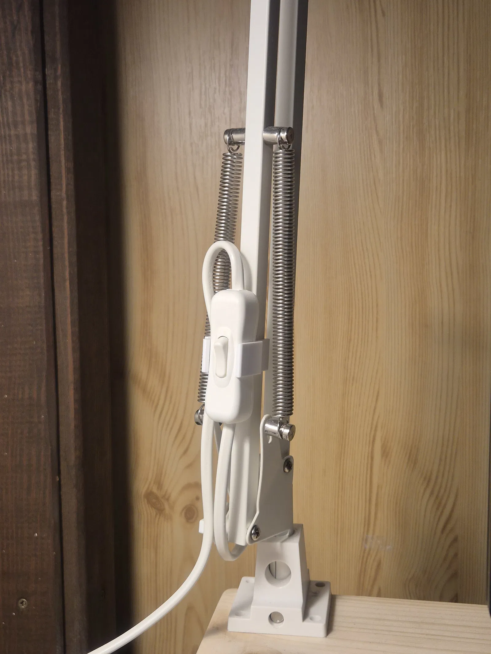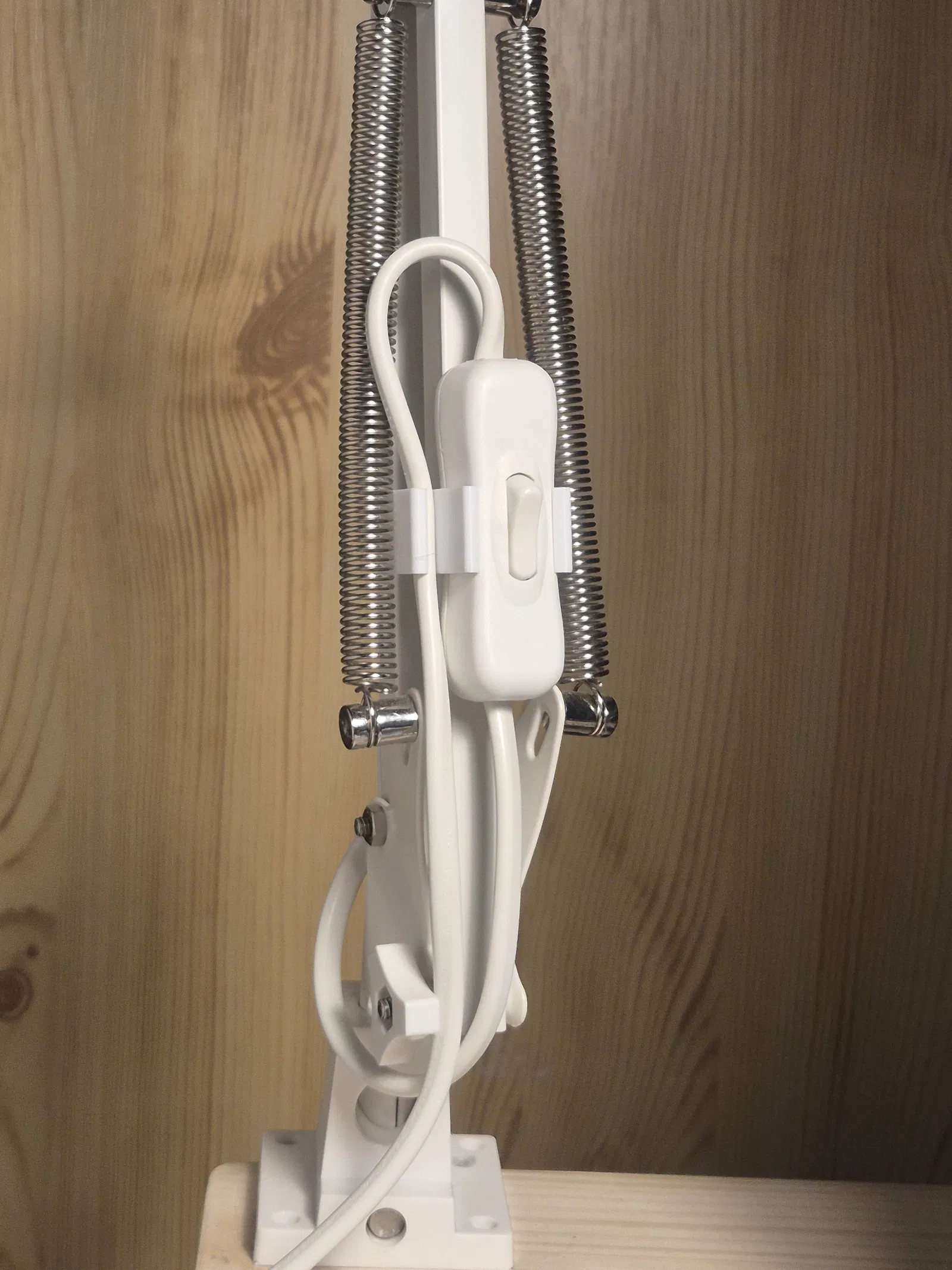 Công tắc đèn cứ vướng víu trên bàn làm việc, nên mình làm một cái switch holder. Công tắc sẽ gắn vào trụ đèn, còn cái kẹp bên hông giữ dây cáp để dây có thể vòng lại gọn gàng rồi đi xuống nguồn điện.
