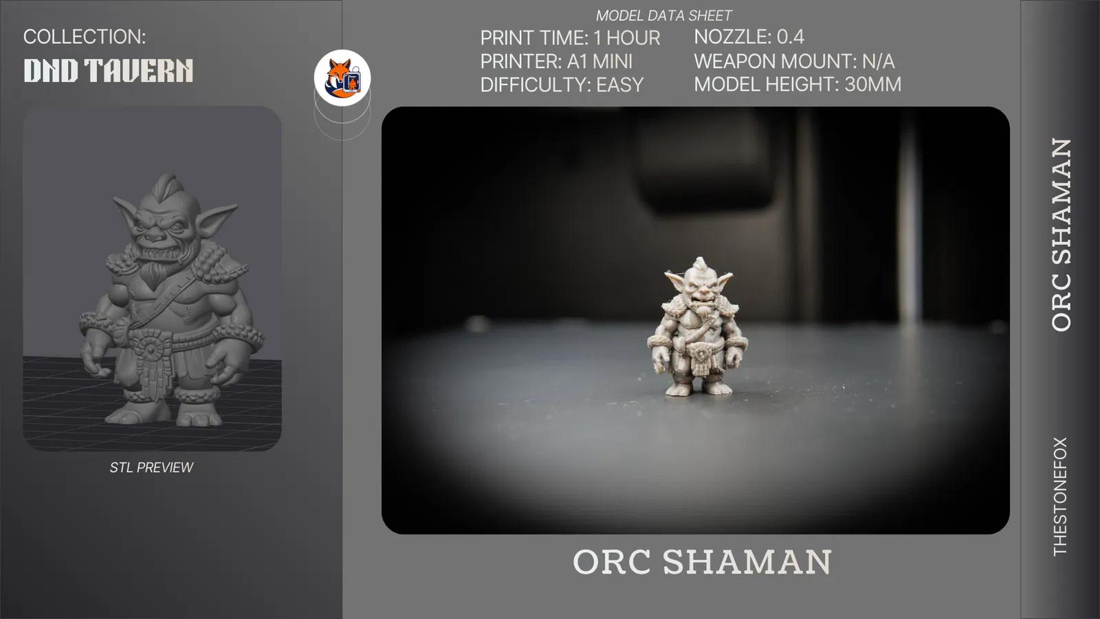 Miniature Orc Shaman từ bối cảnh DnD Tavern, nổi bật với silhouette mạnh, chi tiết nghi lễ và tạo hình dày dặn. Lý tưởng để in 3D trưng bày hoặc dùng cho tabletop; là spellcaster không dùng vũ khí, hết mana là đánh tay đôi.