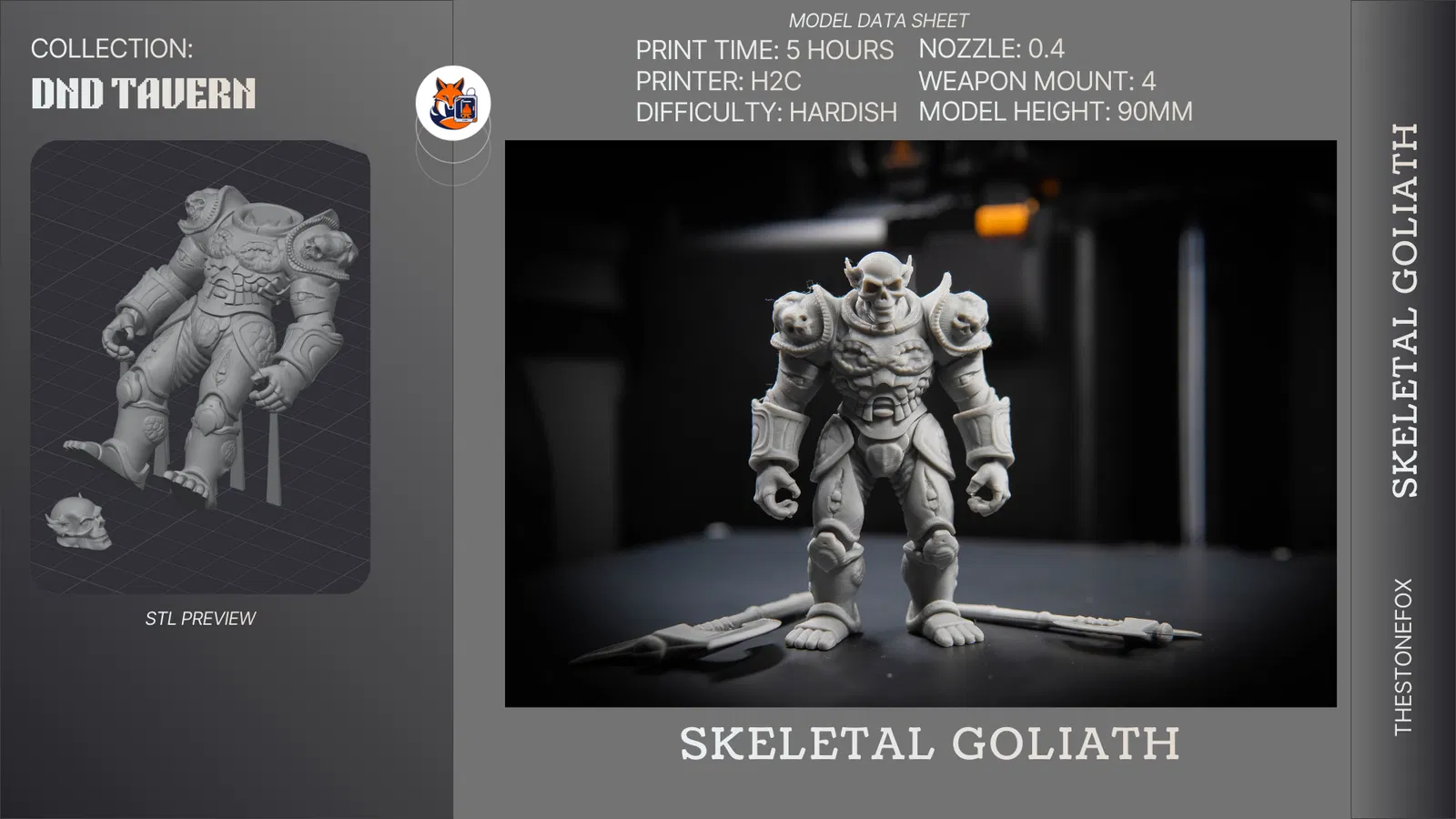 Skeletal Goliath thuộc series DnD Tavern, có hệ mount vũ khí modular để đổi vũ khí nhanh trong lúc chơi: disarm, critical miss, và đổi loadout blunt/bladed/magical. Xem datasheet và “The Armory” để chọn đúng scale.