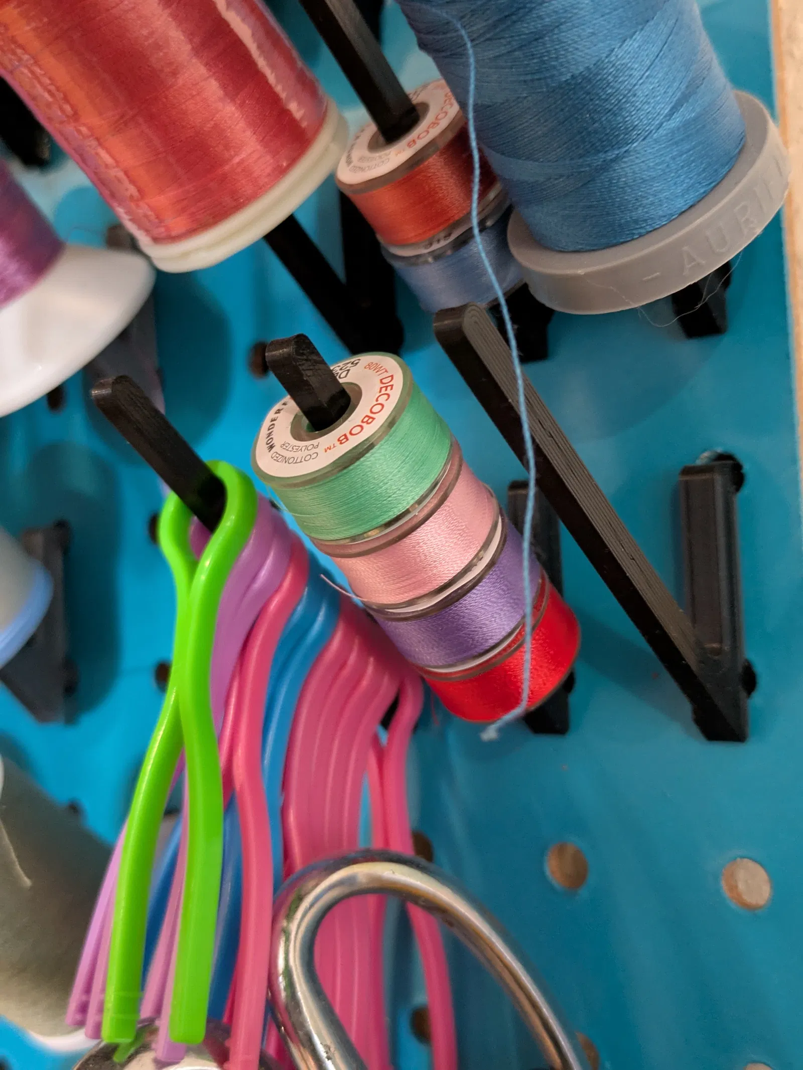 Mẫu Peg Board Bobbin Holder là giá đỡ bobbin gắn lên peg board, giúp sắp xếp các cuộn bobbin gọn gàng, dễ lấy và tiết kiệm không gian trong góc may vá hoặc khu vực làm đồ thủ công.