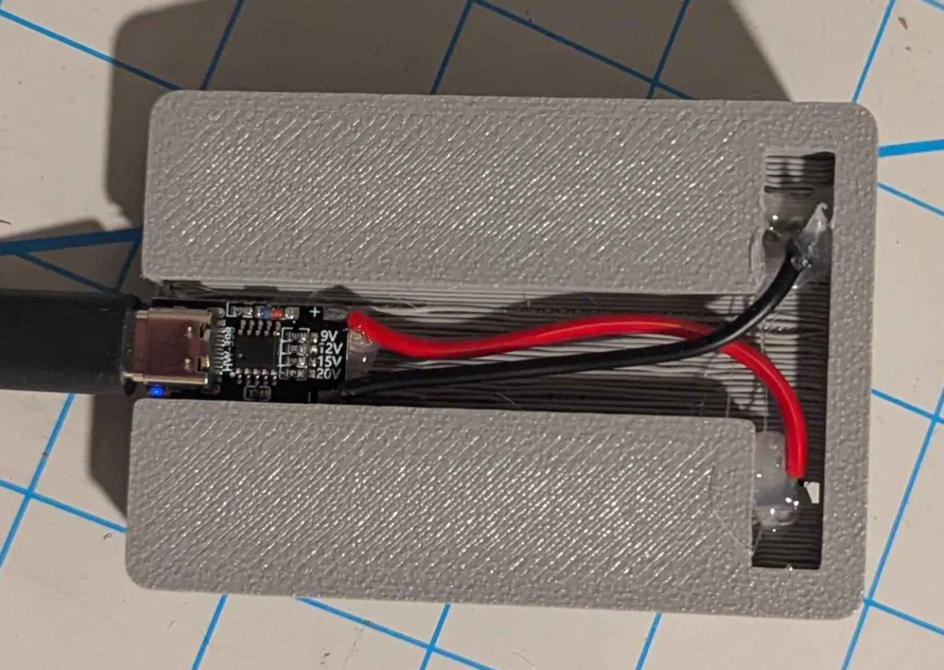 Một USB to 5V adapter. Loại này có rất nhiều ngoài thị trường, bạn cứ chọn cái nào nhìn kích thước hợp lý và nhớ kiểm tra nó ra đúng 5V, không phải mấy mức PD voltage cao hơn. Mình dùng mẫu này, nhưng lưu ý là phải chỉnh jumper để nó xuất 5V; chắc bạn cũng có thể tìm chỗ khác mua loại chỉ 5V sẽ tiện hơn. https://www.amazon.com/dp/B0DBPP52FD?th=1