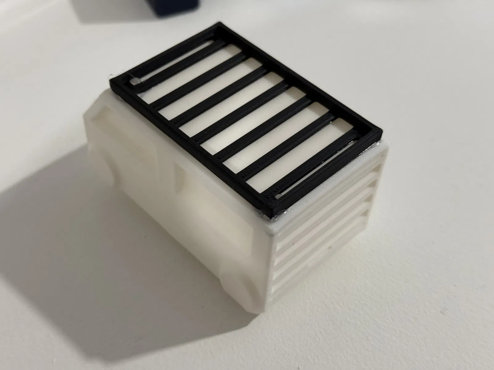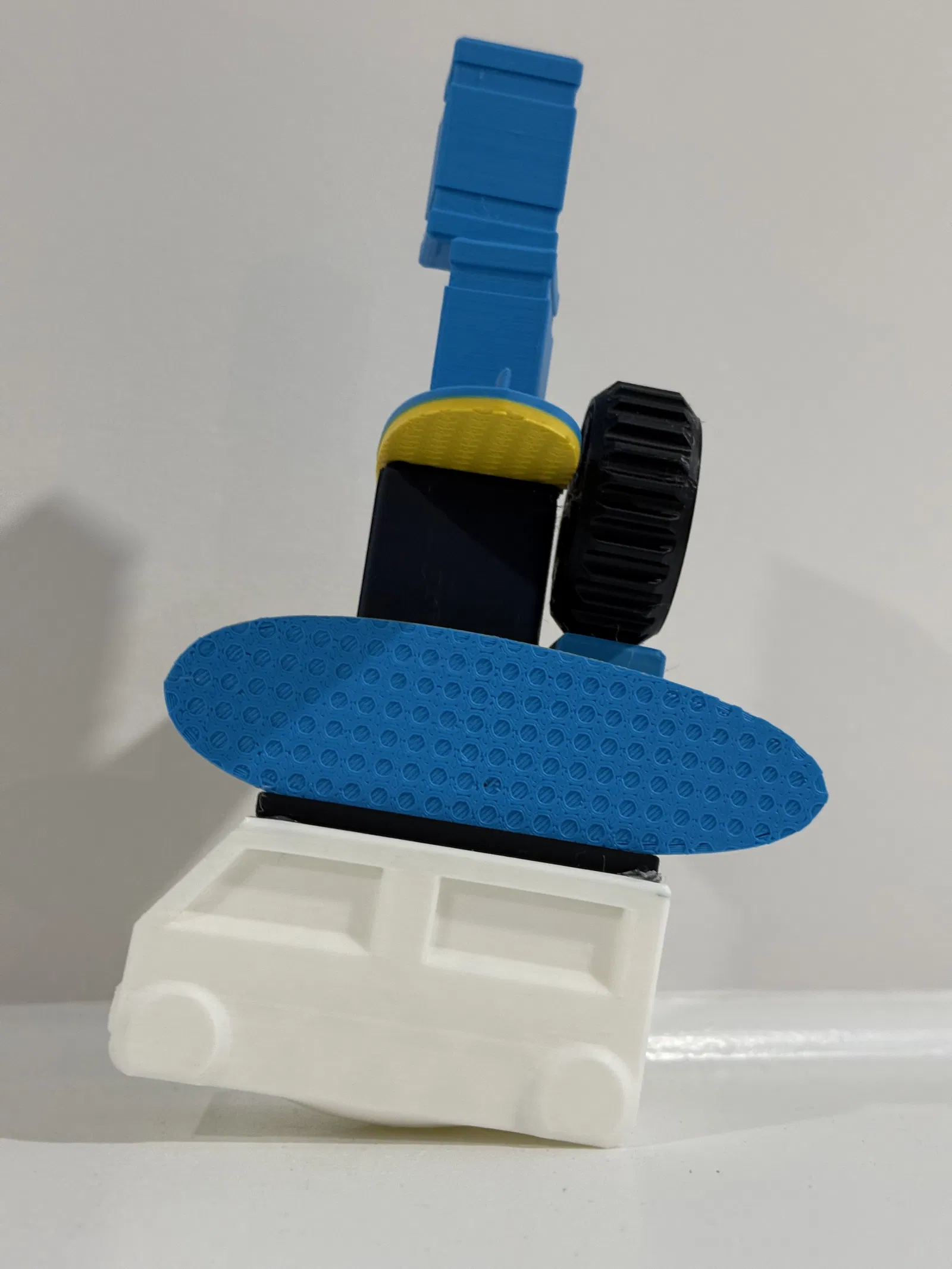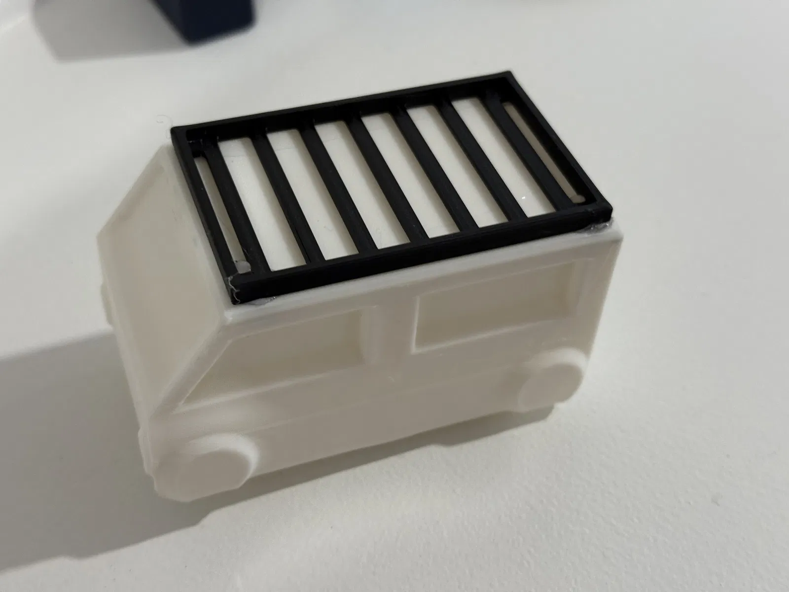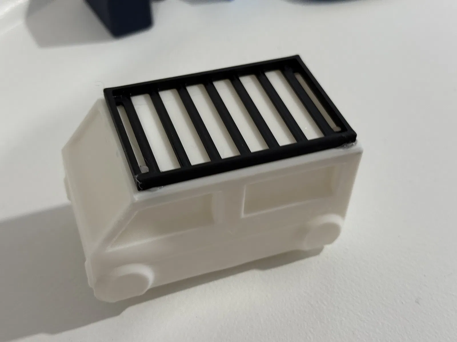 Xe được chia làm 2 phần: thân xe và baga nóc (roof rack). Bạn in riêng từng phần. Trên trần xe có 4 lỗ để dùng keo nến (hot glue) dán roof rack vào thân xe. Nếu bạn không muốn dùng keo nến hoặc không có, bạn có thể in phiên bản thân xe không có lỗ.