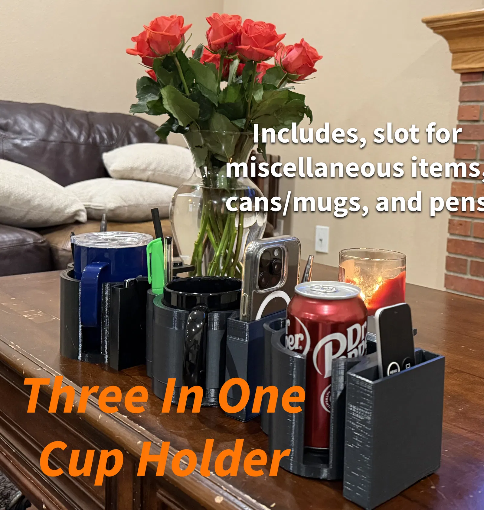 Kẹp để bàn 3-trong-1 giữ ly/cốc/chai, có khe để điện thoại và chỗ cắm bút. Có 3 size (small/medium/large). Khuyến nghị in PLA hoặc PETG, dùng nozzle 0.4 mm và chỉnh tốc độ in phù hợp.
