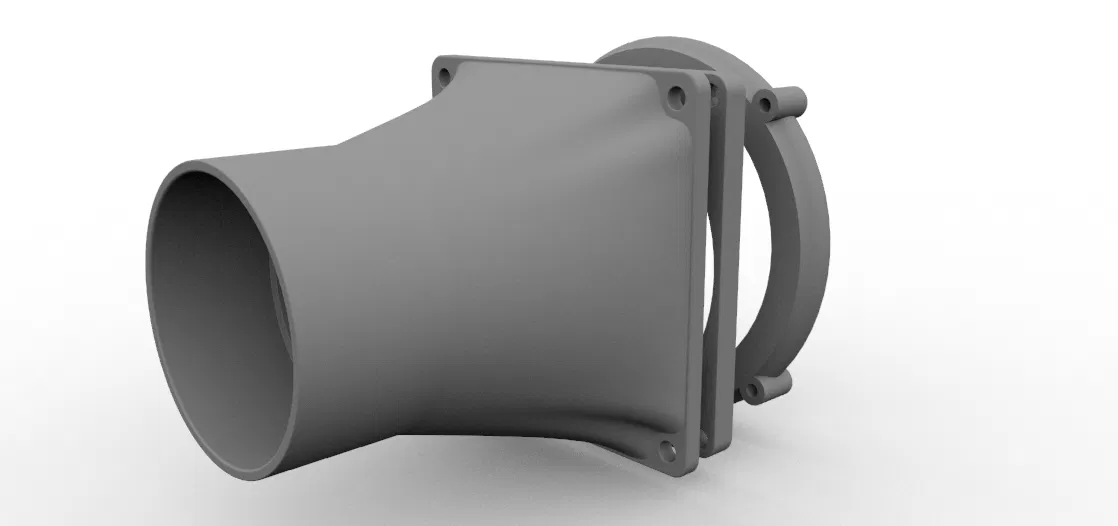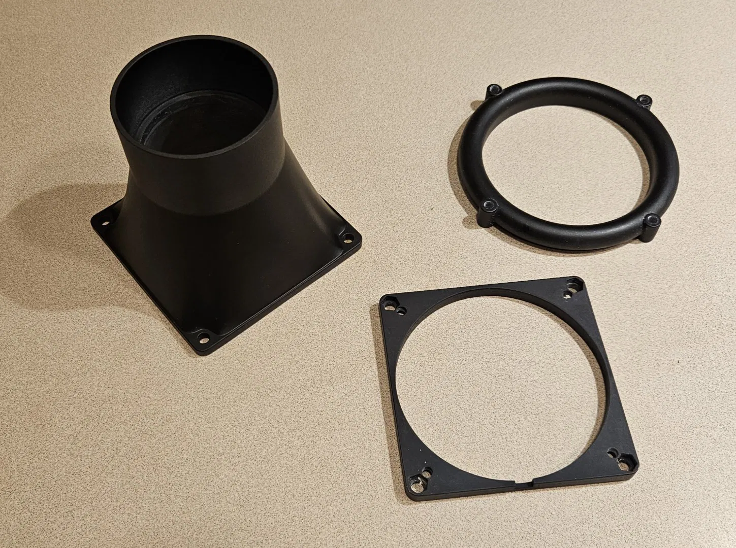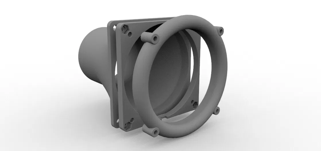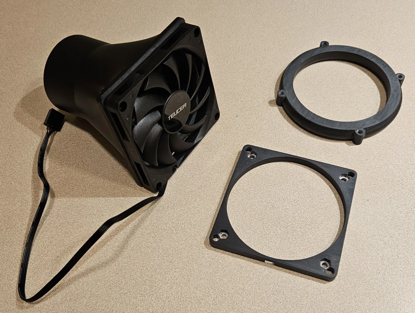 Mình thiết kế adapter quạt này cho S4U. Kích thước được canh cho quạt PC tiêu chuẩn 80mm, ôm rất khít lên cổng xả 75mm của máy in. Adapter quạt được gắn ở bên ngoài máy, bắt bulông xuyên qua các lỗ gá vào phần inlet bo góc (tùy chọn). Cụm fan & duct adapter funnel sẽ lắp xuyên qua vào tấm adapter plate.