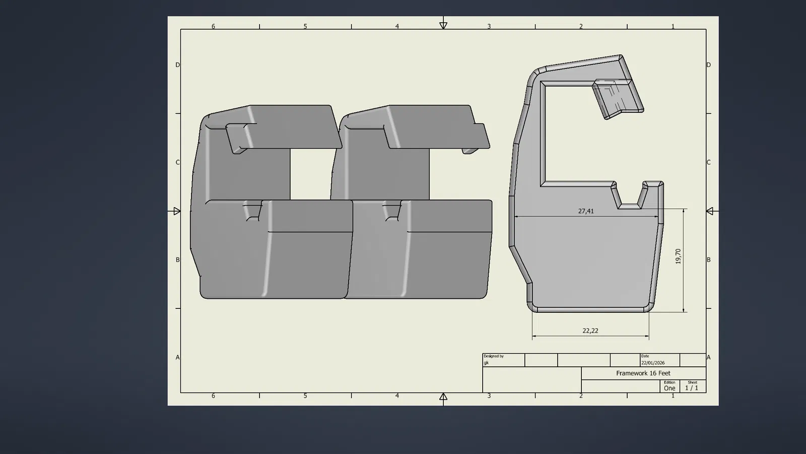 Chân kê nâng nhẹ Framework 16 (AMD Ryzen AI 300 Series) bản chỉ iGPU, giúp thoáng khí tốt trên bề mặt mềm. Thiết kế kẹp vào bản lề, cần in TPU để đủ dẻo, có chân trái/phải và tháo rời dễ cất.