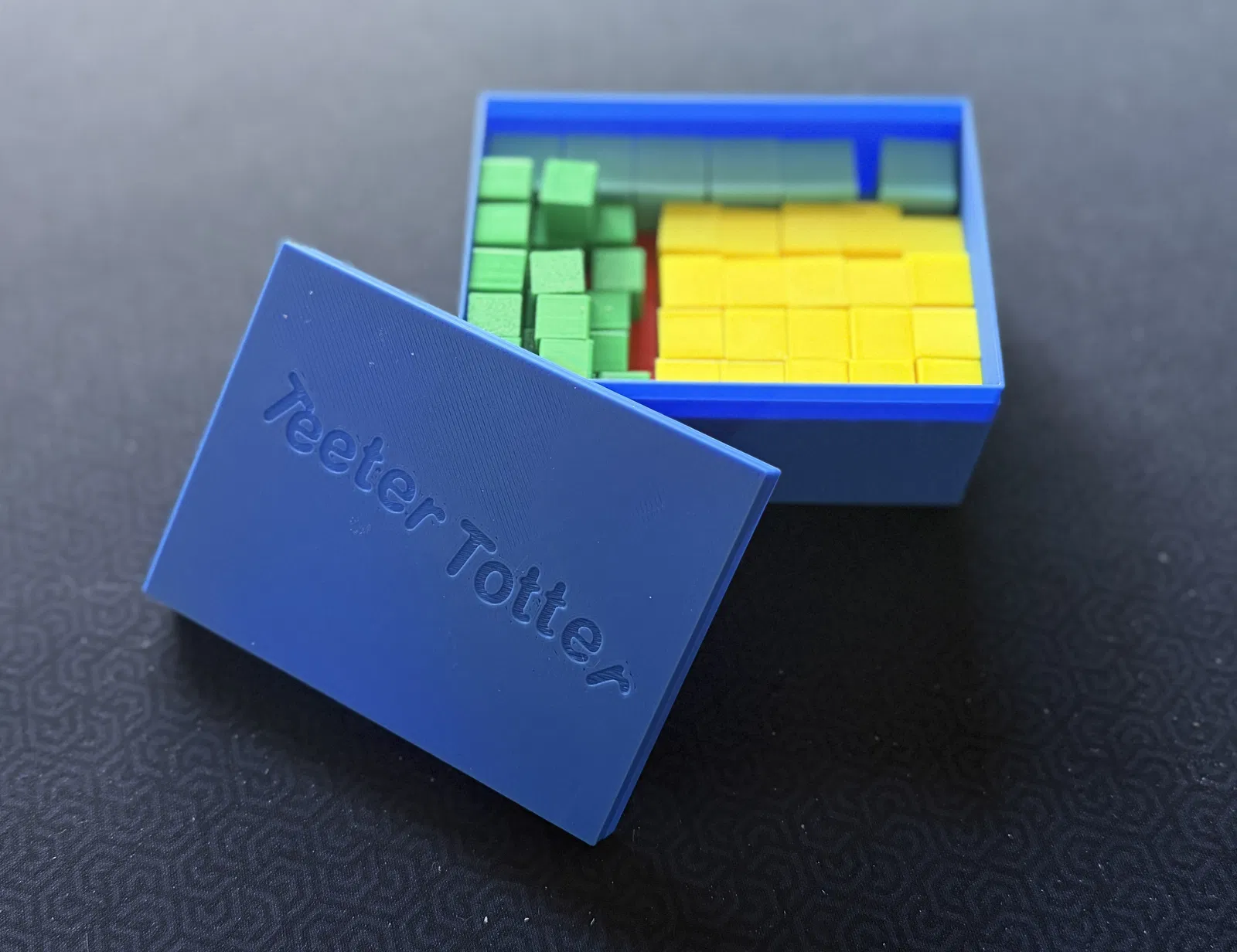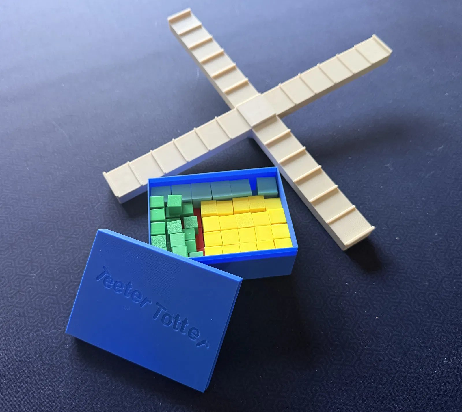 Teeter Totter là trò bập bênh xếp khối: lần lượt đặt khối lên tay đang nâng mà không làm rơi. Ai đặt hết khối của mình trước mà không làm rớt miếng nào là thắng. Có hướng dẫn in 3D và hộp lưu trữ.