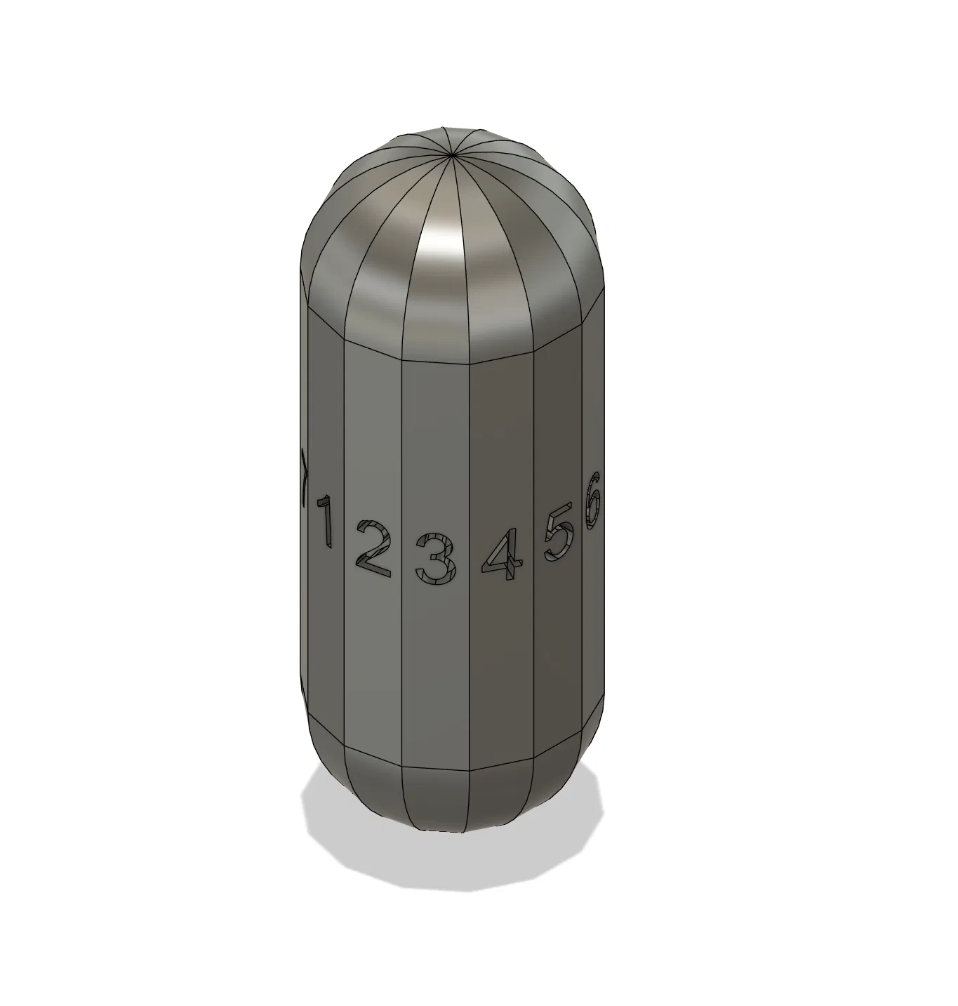 Đây là một con d7 hình trái dưa leo (pickle). Về mặt kỹ thuật nó có 14 mặt, nhưng được chia thành 2 bộ số từ 1–7 để vẫn đúng là một con d7 “chuẩn”.