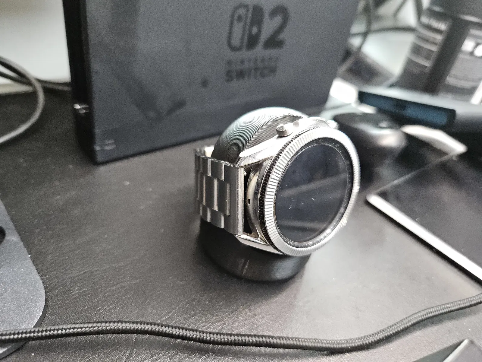 Dock để bàn in 3D custom cho Galaxy Watch 3, dùng cục sạc nam châm zin. Thiết kế nghiêng 71° để nhìn rõ khi ngồi làm việc, fit puck sạc khít, đứng vững cả khi dùng dây kim loại nặng, đi dây gọn gàng.
