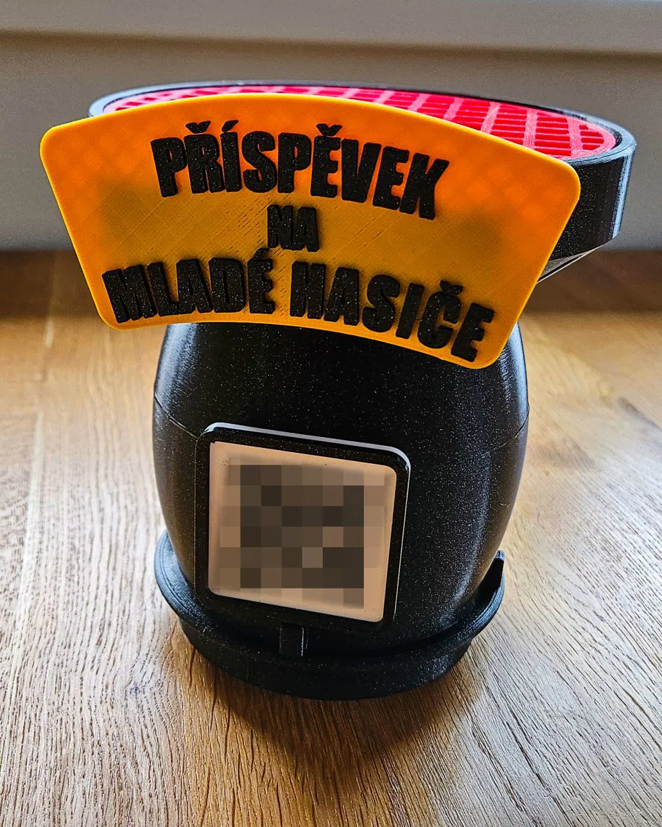 Mô hình 3D thu nhỏ sací koš dùng làm ống heo cho thiếu niên cứu hỏa, có mặt phẳng dán QR code, khe thả tiền trên lưới và nắp vặn bên dưới. Có thể in trên Mini, tăng size trong PrusaSlicer.