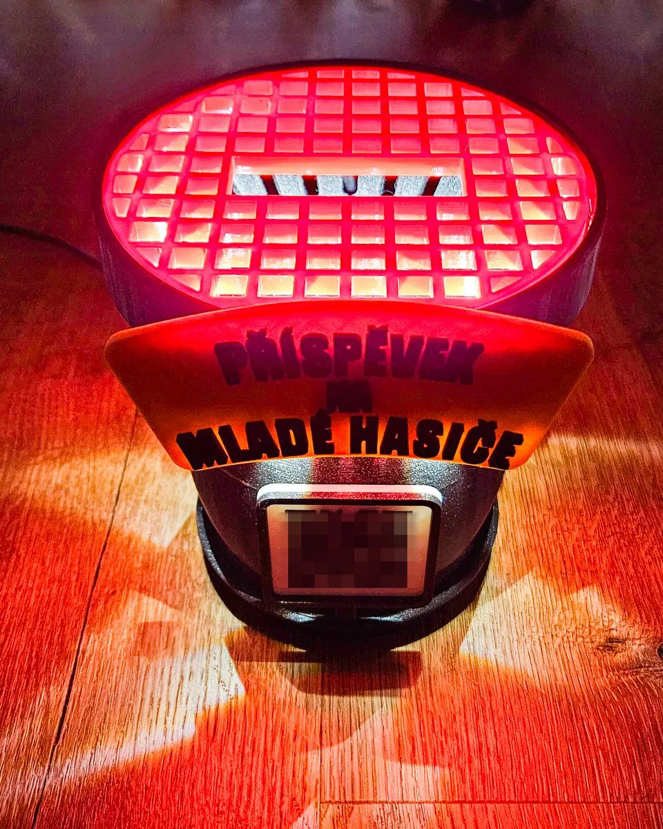 Mô hình 3D thu nhỏ của sací koš, được làm như một ống heo cho các bạn thiếu niên cứu hỏa. Trên thân giỏ có một mặt phẳng để dán QR code phục vụ thanh toán không tiền mặt. Ở phần lưới phía trên có khe để thả tiền vào, phía dưới là nắp vặn ren. Để tăng độ an toàn, ở mép phần trên có một lỗ để cố định vào vật chắc (ví dụ như khung lều party).