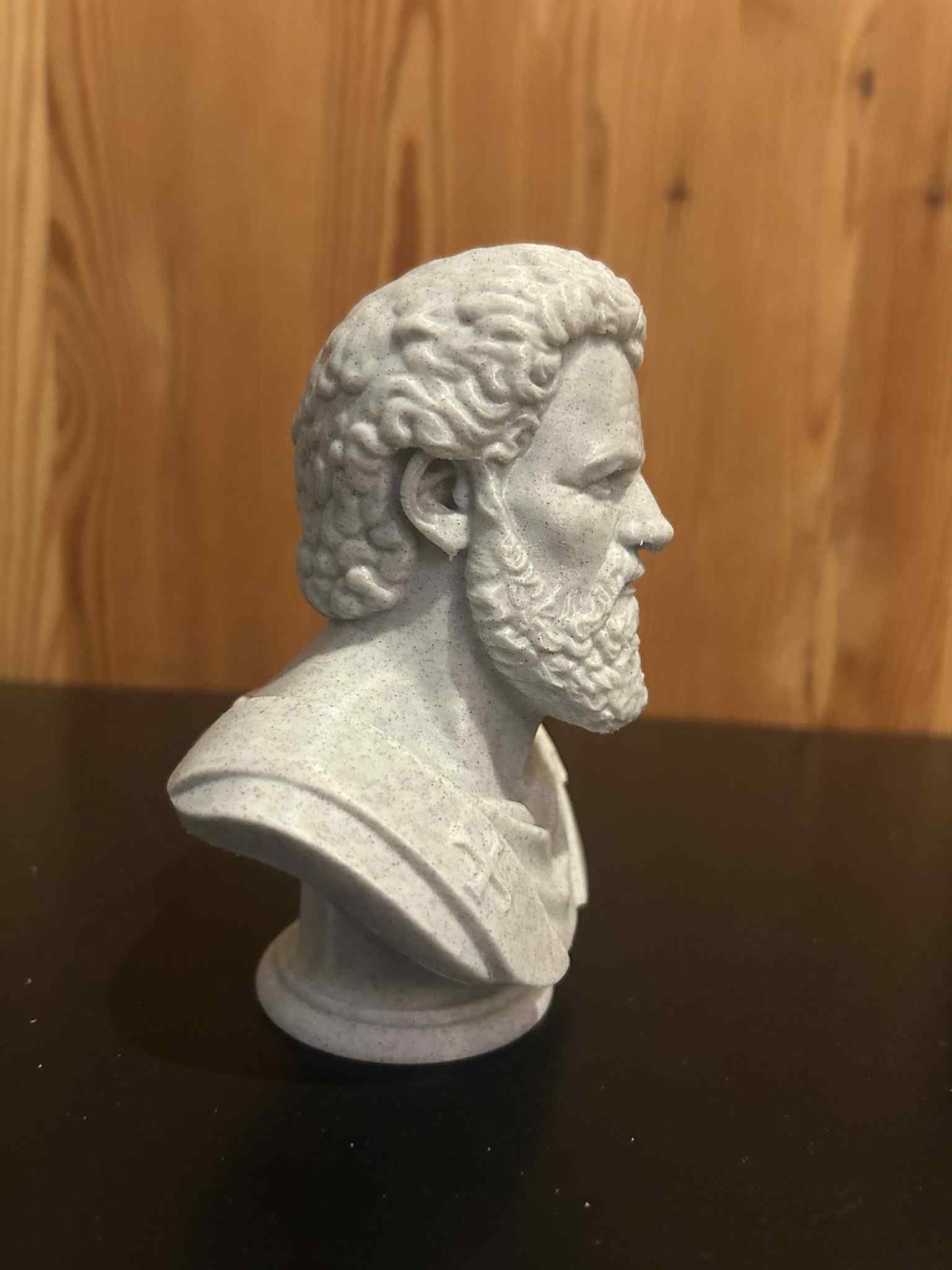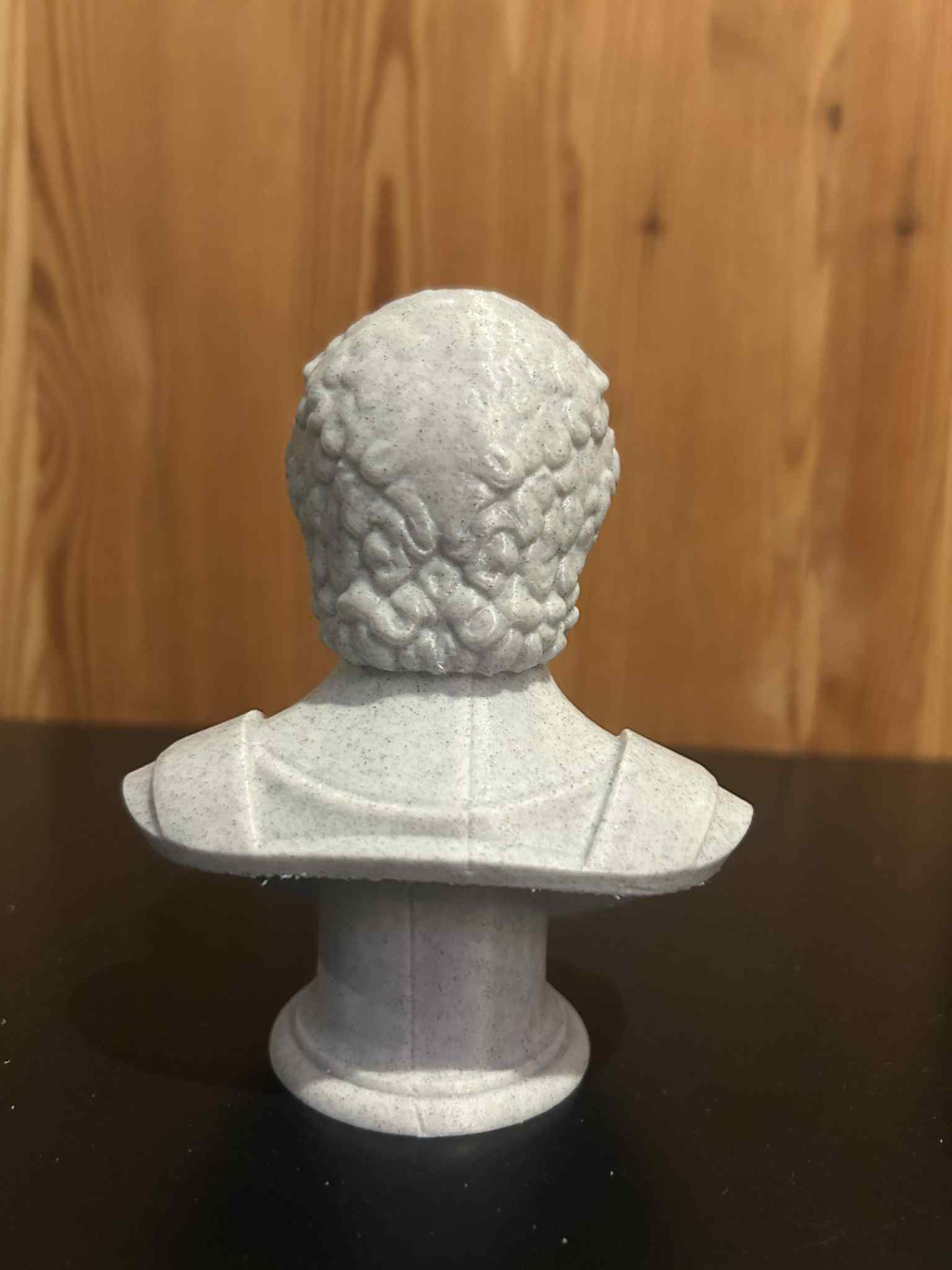 Nhân vật được thể hiện nhìn thẳng, ở tư thế trung tính và trang nghiêm. Tỉ lệ khuôn mặt được bảo tồn cẩn thận để đảm bảo dễ nhận diện ngay. Các chi tiết được tạo hình mạnh và rõ nét: ánh mắt trực diện truyền tải sự bình tĩnh và quyết đoán, còn bộ râu dày cùng mái tóc gọn khối nhấn mạnh vẻ trí tuệ và chững chạc. Cách xử lý điêu khắc ưu tiên các mảng khối rõ ràng, dễ đọc, tạo cho bust một hiện diện vượt thời gian, rất phù hợp cho in 3D.