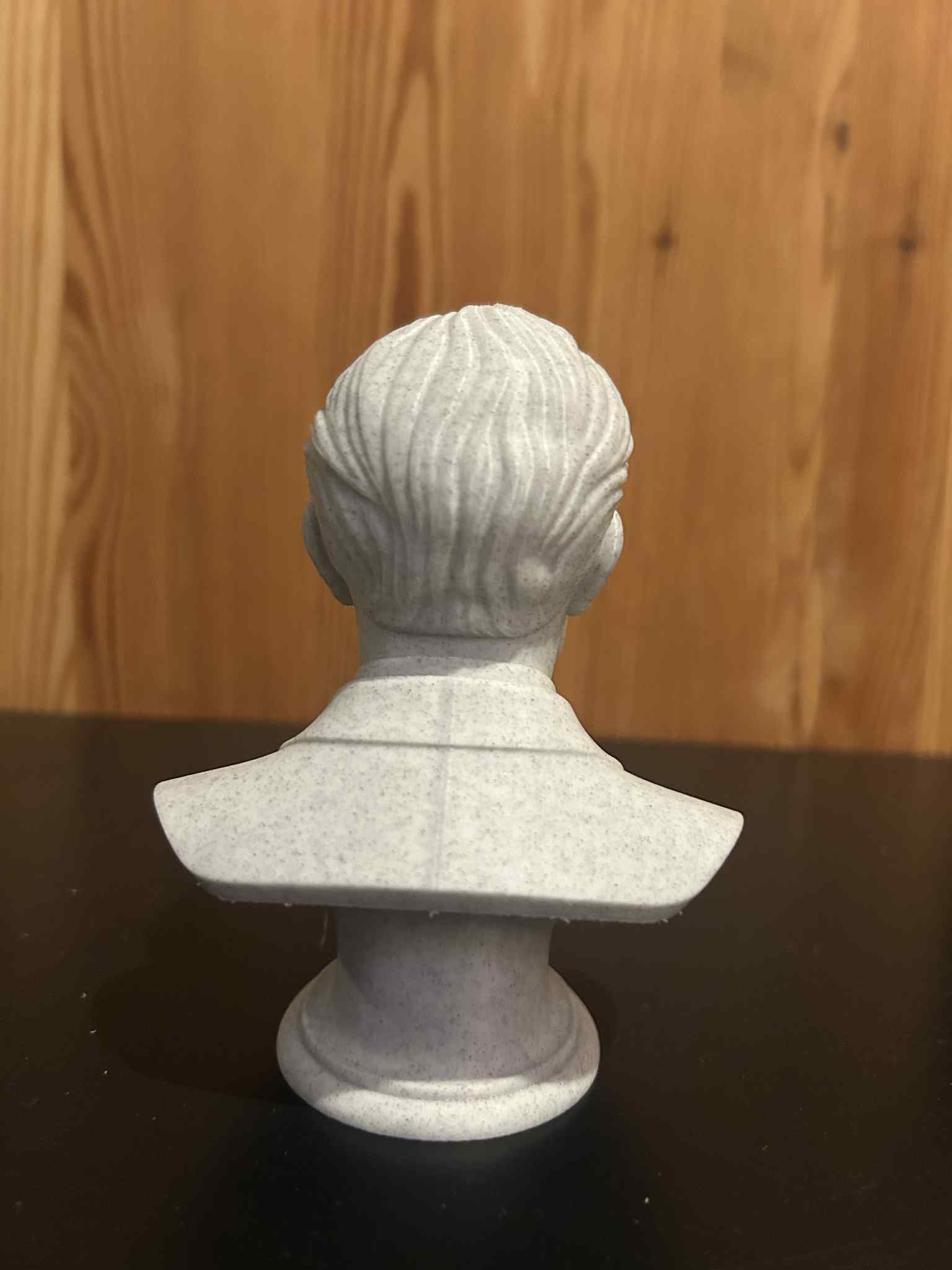 Khuôn mặt được thể hiện theo hướng nhìn thẳng, với tư thế trung tính và điềm tĩnh. Tỉ lệ được giữ kỹ để đảm bảo nhận diện nhân vật ngay lập tức. Các đường nét được nhấn mạnh rõ ràng, dễ đọc: ánh nhìn tập trung thể hiện sự nghiêm cẩn về trí tuệ; còn các đường nét khuôn mặt, kiểu tóc gọn gàng và biểu cảm nghiêm túc gợi lên chiều sâu suy tư và tinh thần khoa học. Cách xử lý ưu tiên các khối rõ và có cấu trúc, tạo cảm giác gọn, “đã mắt” và mang tính vượt thời gian—rất hợp để in 3D dạng bust.