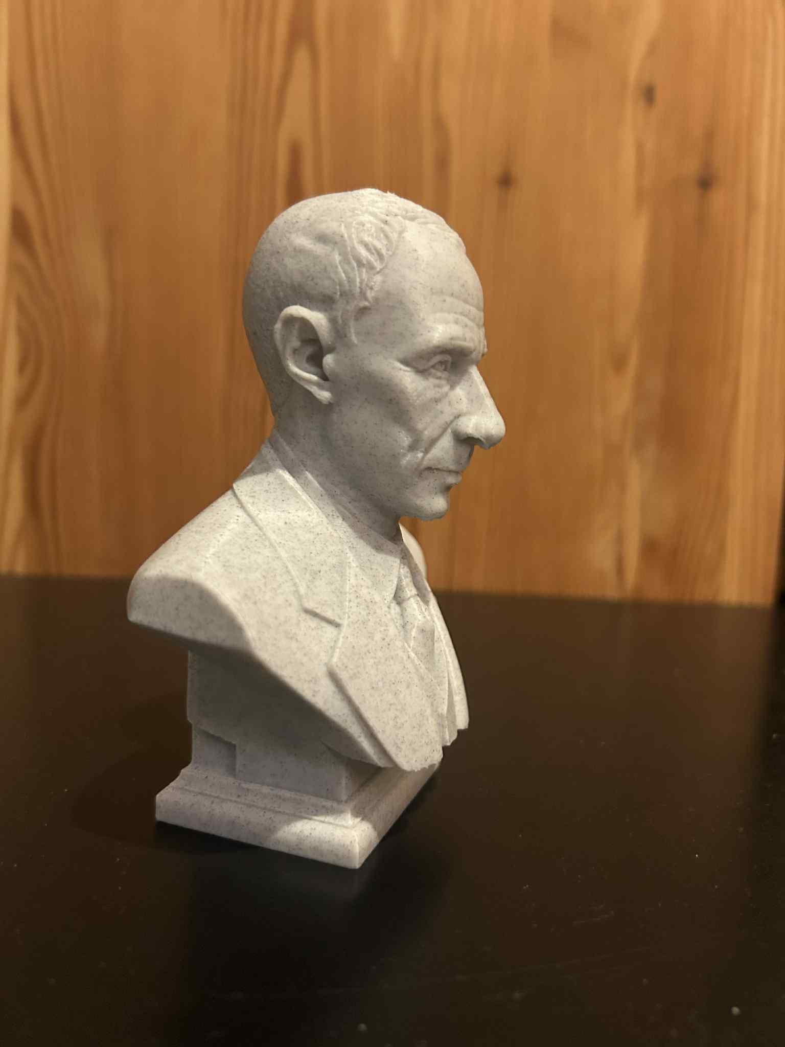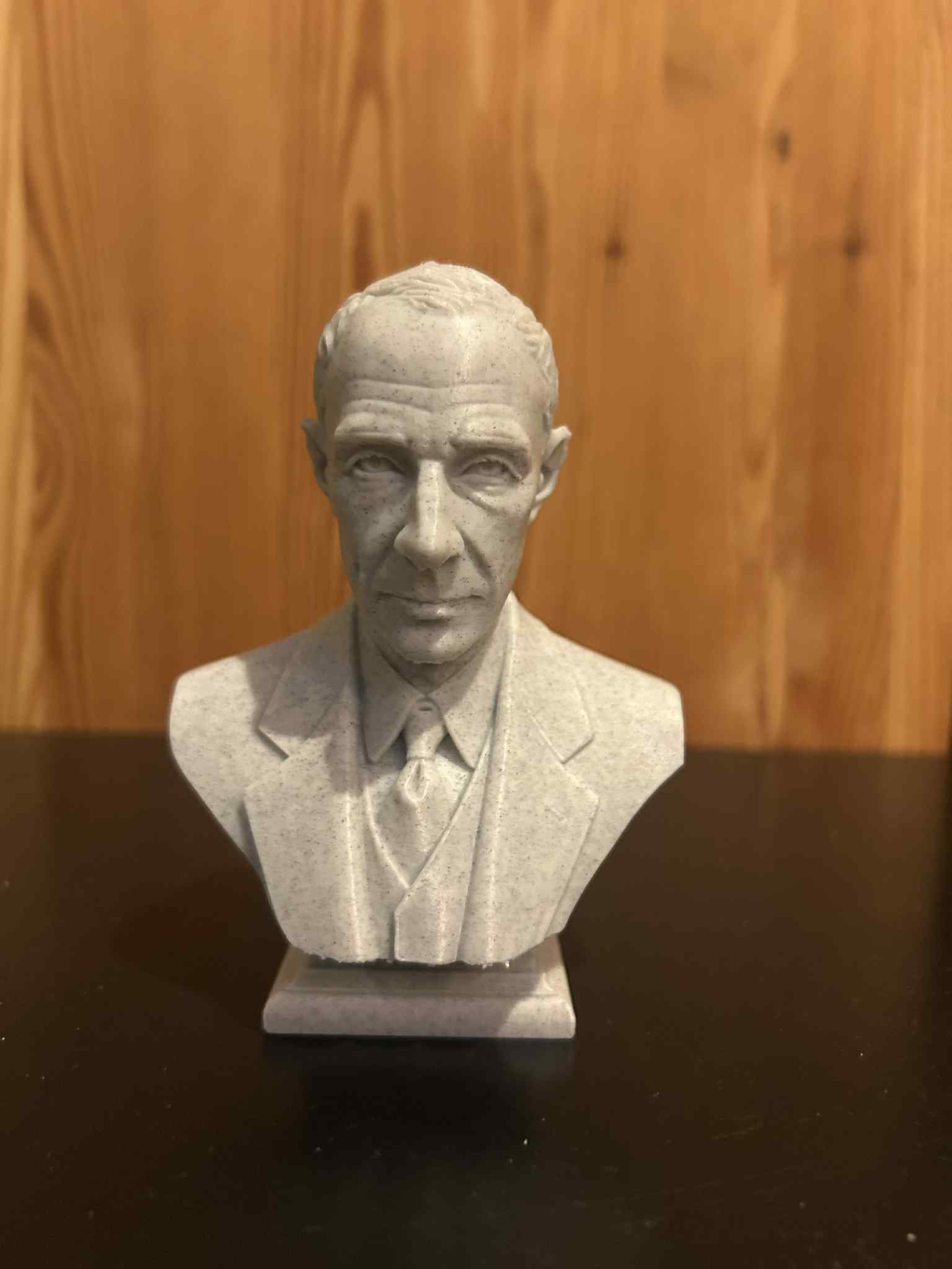 Mẫu bust tái hiện Julius Robert Oppenheimer dựa trên hình ảnh biểu tượng: nhìn thẳng, vẻ điềm tĩnh và suy tư. Tỷ lệ gương mặt chuẩn, đường nét giản lược nhưng rõ khối, rất hợp để in 3D dạng tượng bán thân.