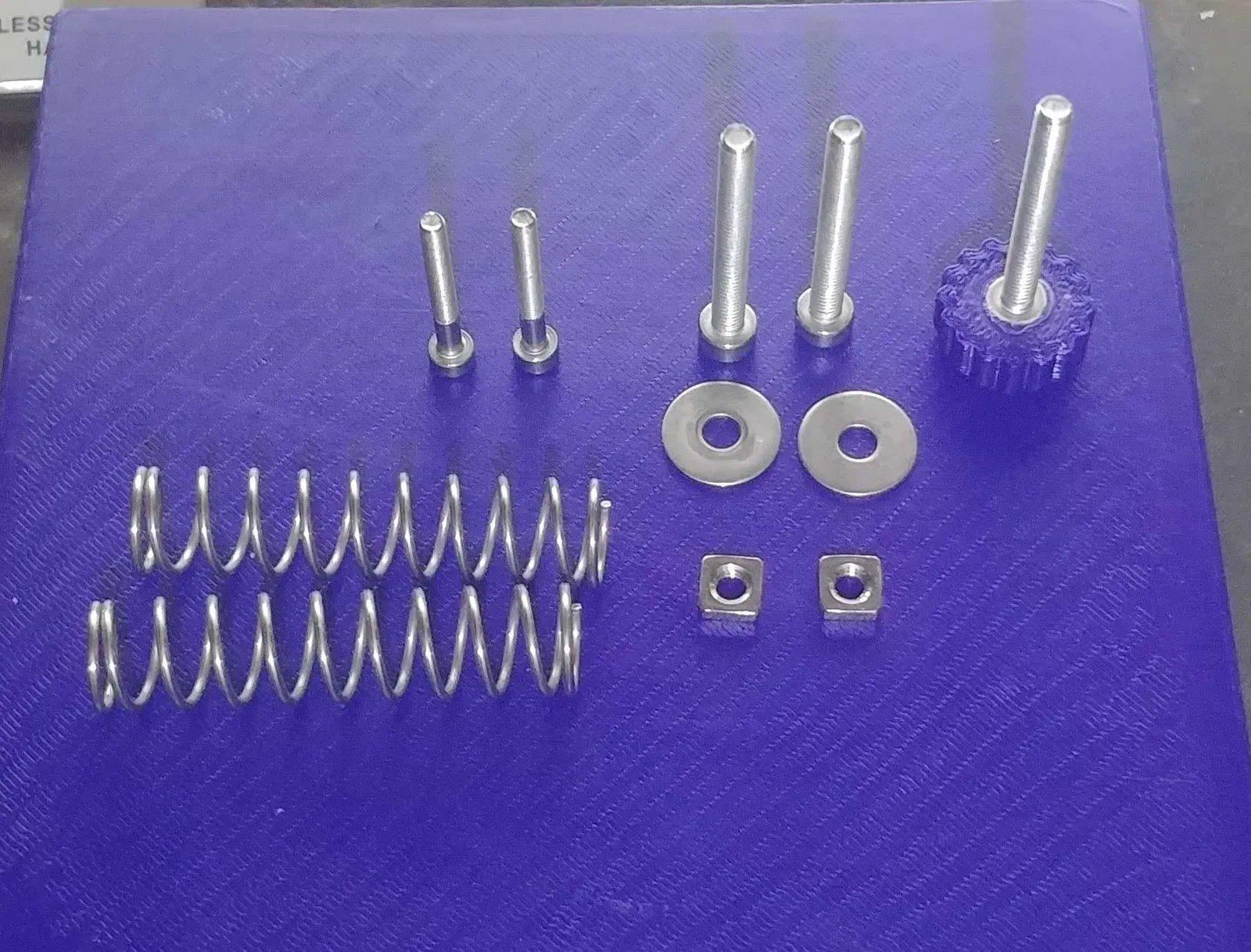 2 lò xo (spring), đường kính trong từ 8.5 đến 9.5 mm và đường kính ngoài nhỏ hơn hoặc bằng 12 mm, dài 70 mm (trong ảnh, mình dùng hai lò xo 50 mm và hai đoạn 20 mm cắt từ một lò xo thứ ba).