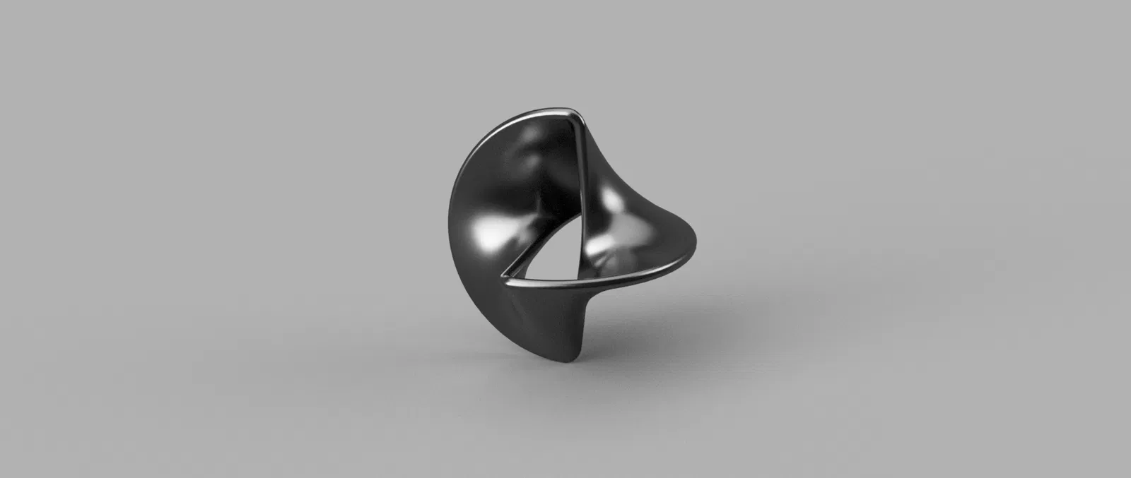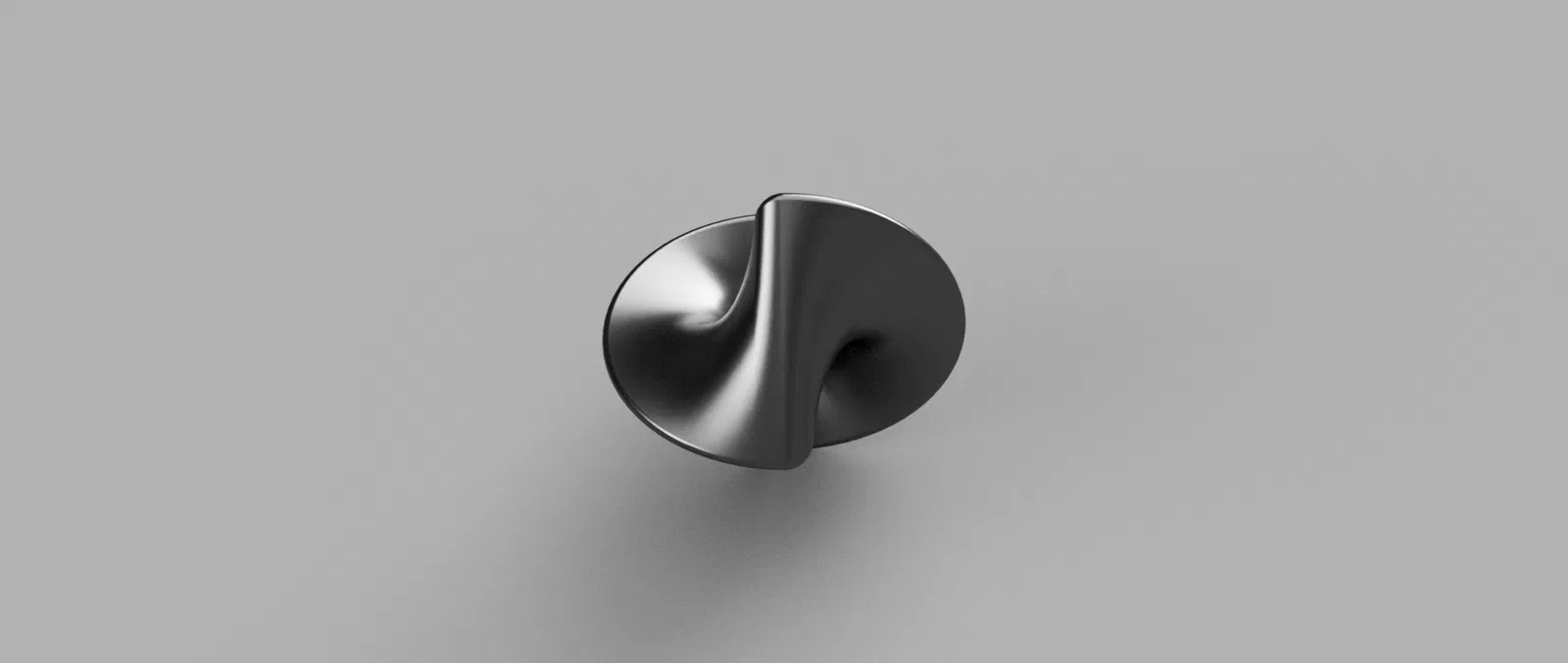 Thử nghiệm trong Fusion 360: loft hai profile cắt nhau để tạo bề mặt lạ mắt. Với hai đường tròn thì ra anti-oloid; còn với hai nửa đường tròn theo cách tương tự, tác giả đoán sẽ giống spericon—và đây là mẫu thử.