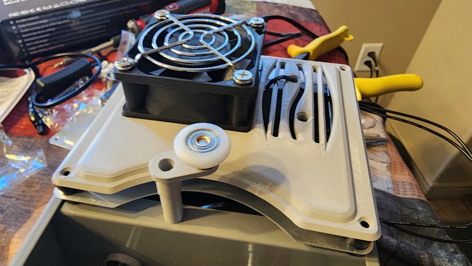 3. Thay nắp che motor bằng một cái in 3D để gắn thêm muffin fan mới. Cách này giúp motor (vốn chạy khá nóng) mát hơn rất nhiều. Mình đấu nó vào công tắc để bật/tắt cùng máy.