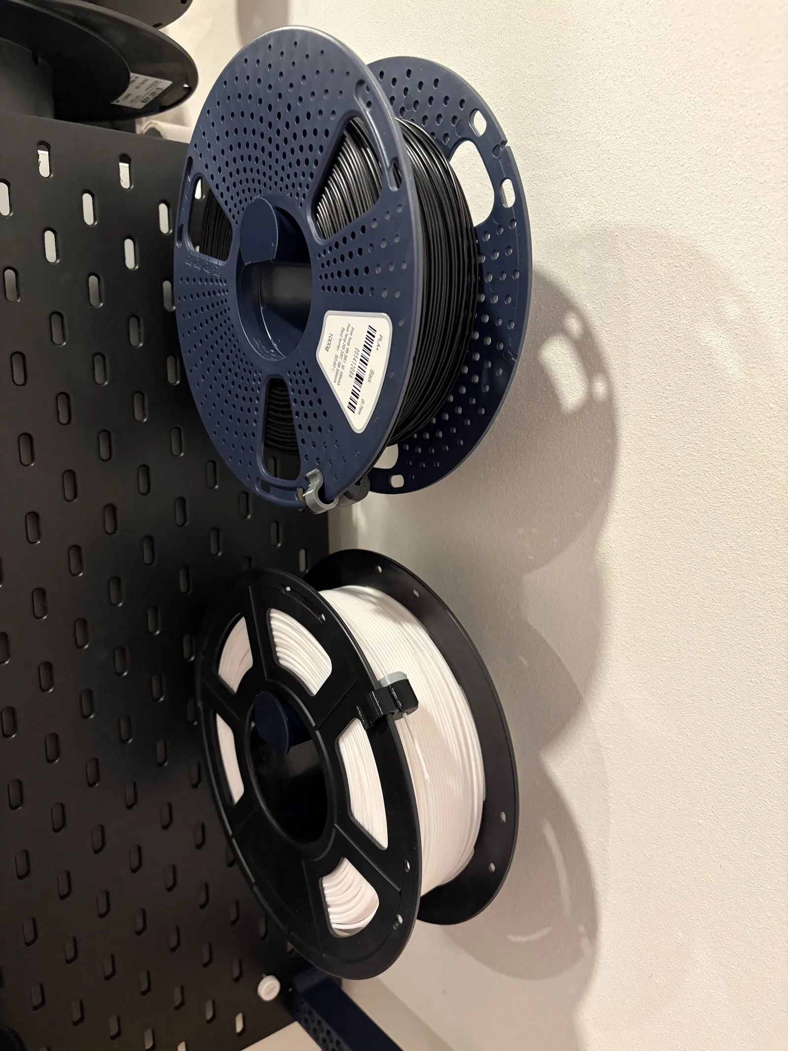 Giá đỡ cuộn (spool holder) cho bảng treo tường Ikea Skadis. Bản V2 phù hợp cuộn Sunlu loại mới đường kính 67 mm. Bản V3 dành cho cuộn nặng, cố định bằng T-nut 2.5 mm.