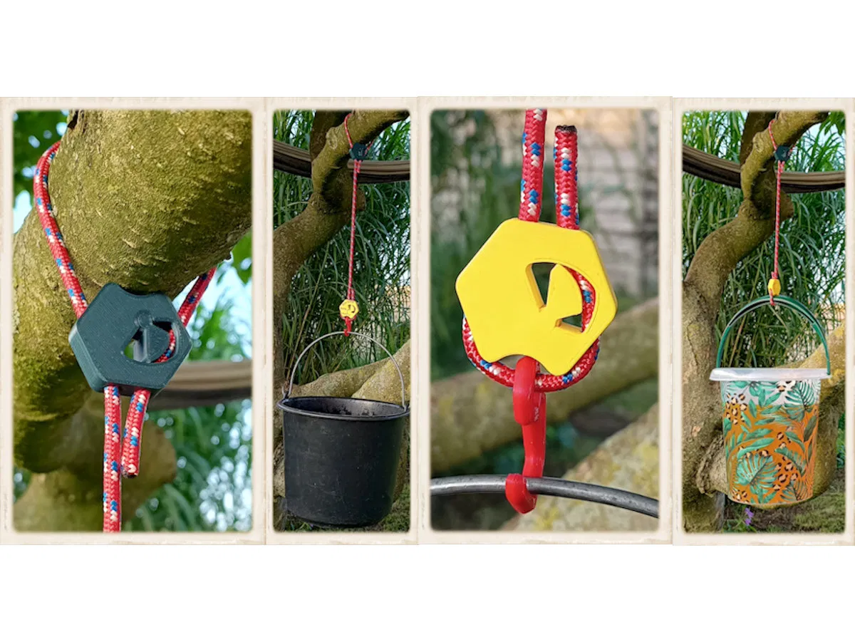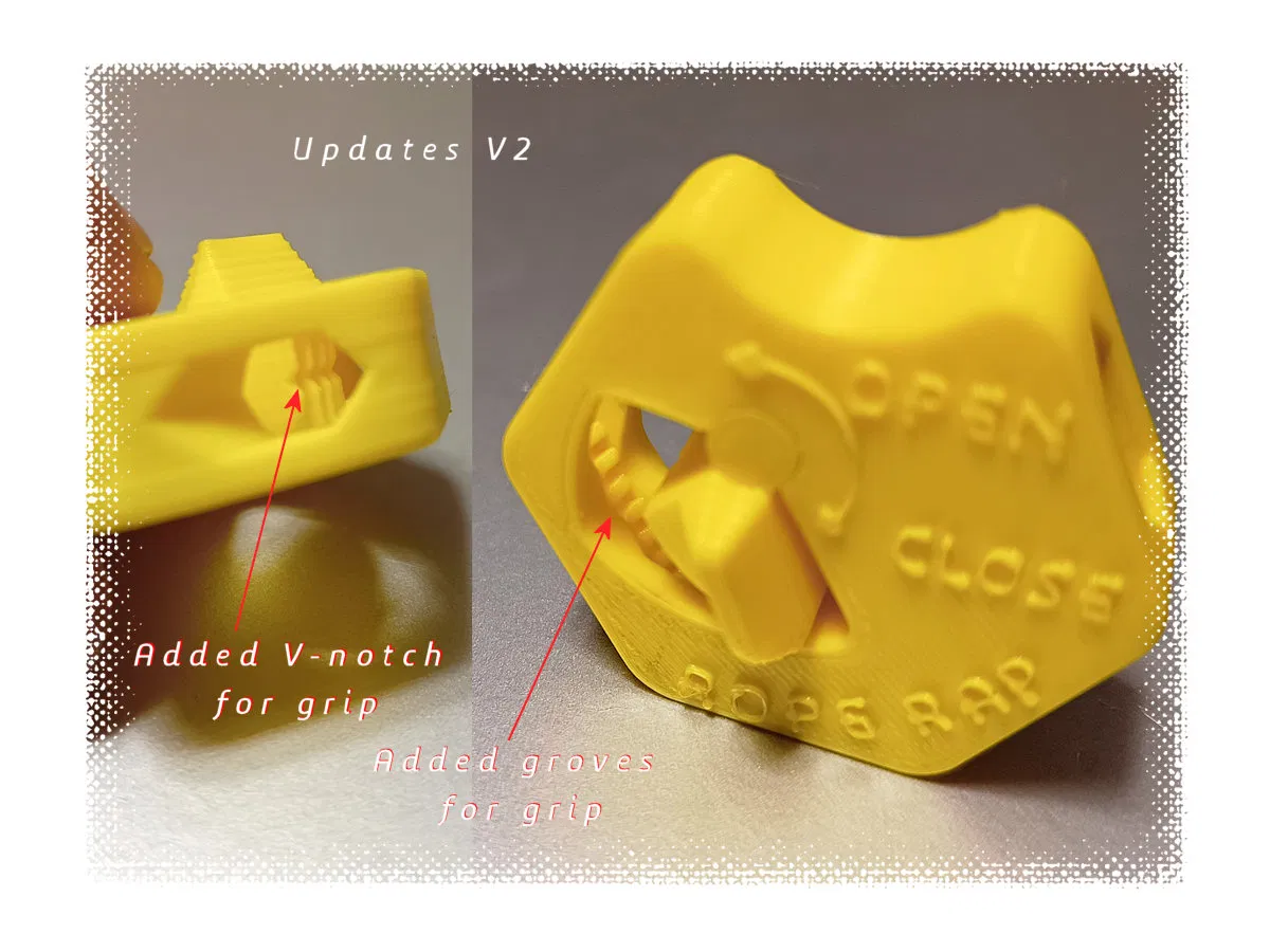 Rope Rap là “zip-tie” dành cho dây thừng: căng dây treo hoặc nối hai đầu dây nhanh gọn, không cần thắt nút. Thiết kế cho dây Ø4–6mm, có bản thu nhỏ Ø2.5–4mm; in PLA/PETG, print-in-place pivot.