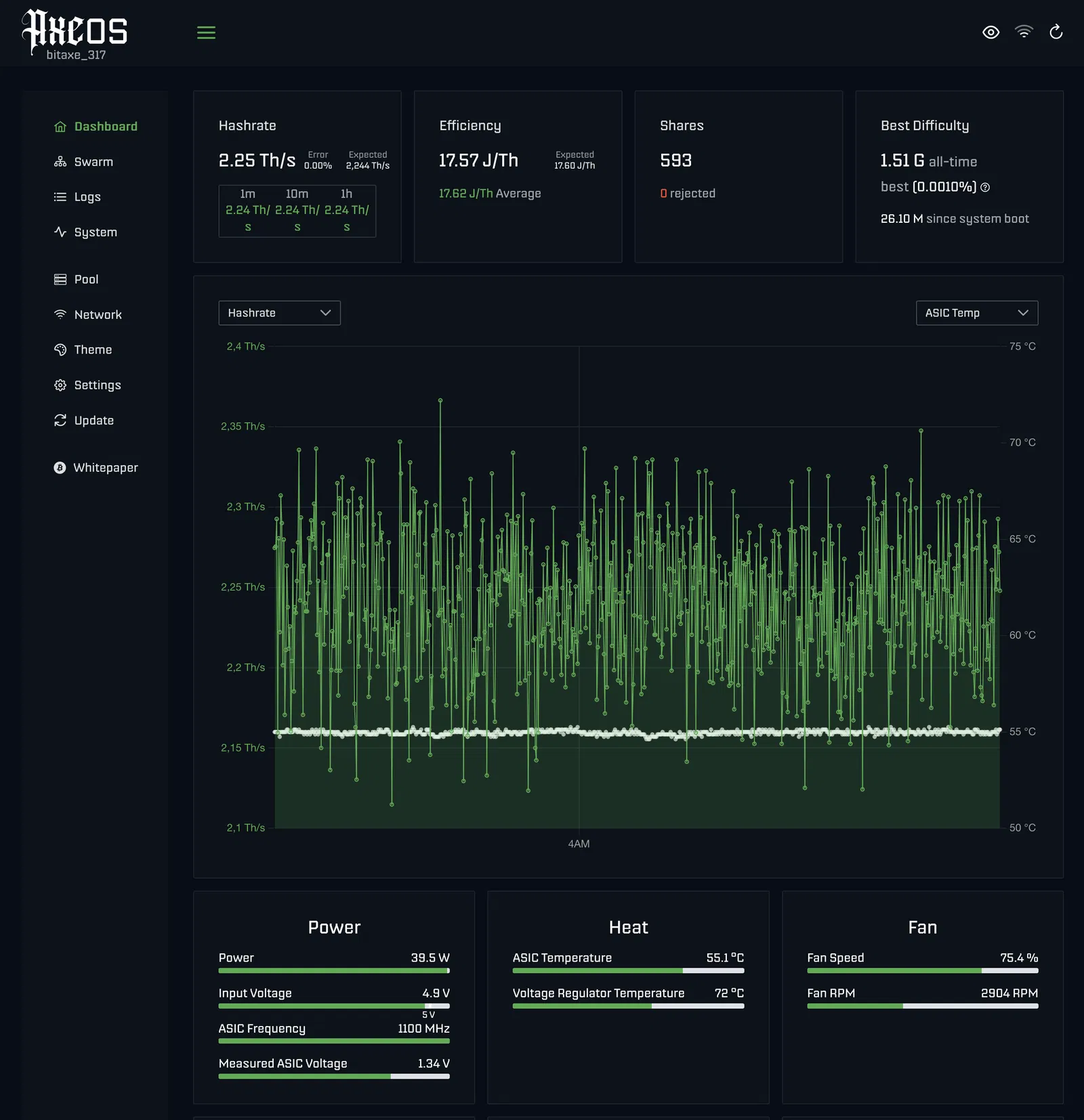 Sau khi lắp xong, mình dùng Bitaxe Hashrate Benchmark của mrv777: https://github.com/mrv777/Bitaxe-Hashrate-Benchmark để xem có thể đẩy hashrate lên tới mức nào (trong đó cũng có các script benchmark khác). Vui lòng đọc kỹ và nghiêm túc các cảnh báo trên trang của bạn ấy! Overclock Bitaxe có thể làm hư thiết bị! Ngoài ra lưu ý là bộ nguồn stock VÀ barrel connector vào Bitaxe vốn đã gần chạm giới hạn hoạt động tối đa! Nếu kéo thêm điện, bạn có nguy cơ quá tải cả hai! Hãy luôn ở trong các giới hạn vận hành này!