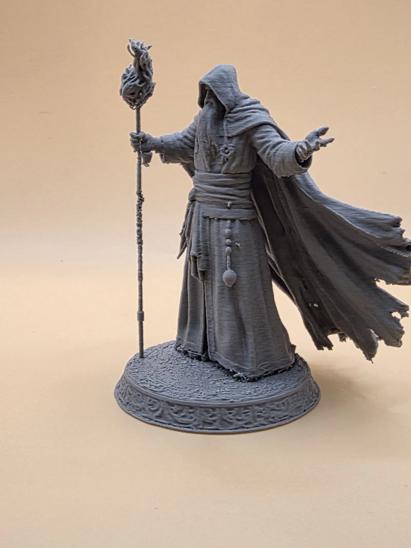 Mô hình 3D pháp sư Dungeons & Dragons cực chi tiết, khoác áo choàng nhiều nếp gấp, cầm gậy phép với đầu gậy hoa văn và dáng đứng như đang niệm chú. Phù hợp in mini, sơn mô hình hoặc trưng bày bộ sưu tập.