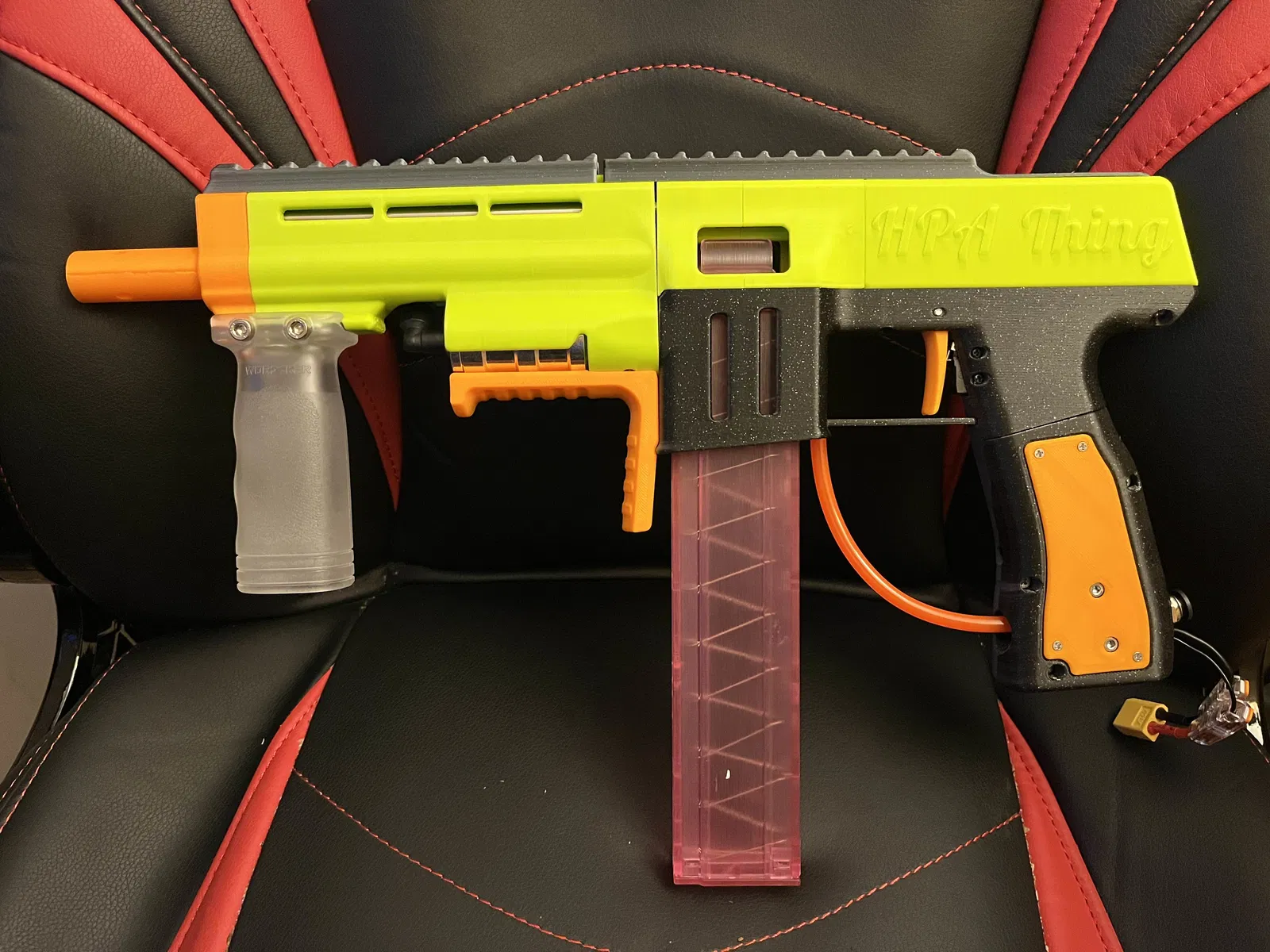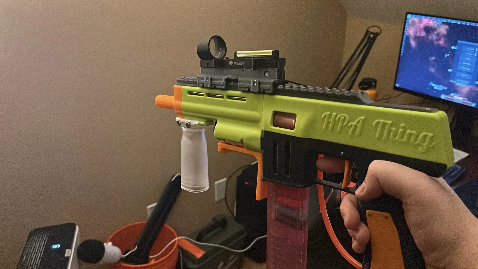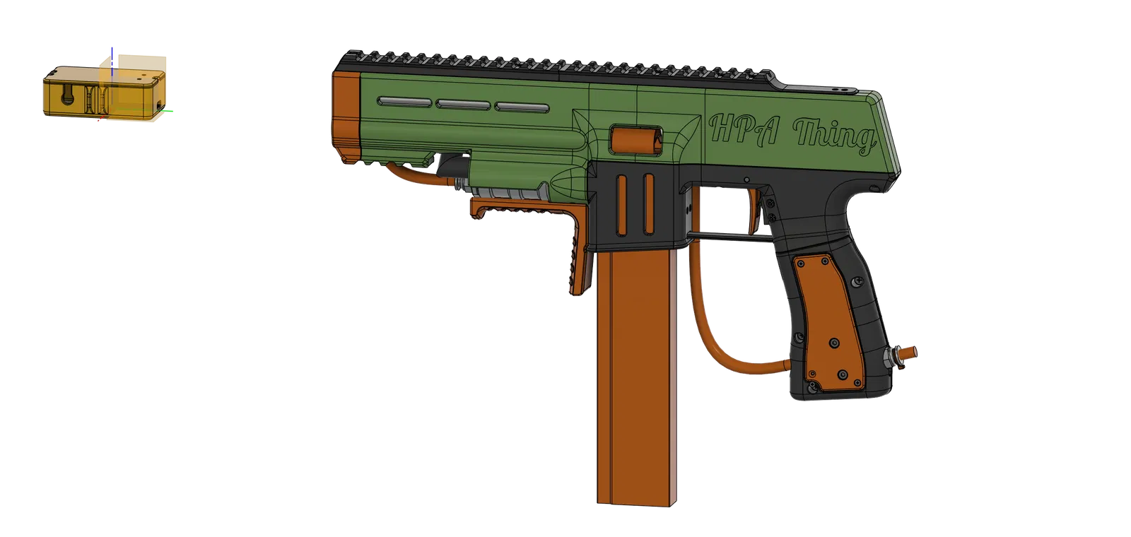 The HPA Thing là Nerf dart blaster bán tự động hoặc tự động hoàn toàn, dùng khí nén áp suất cao (HPA) từ bình Paintball qua regulator và HPA core Cosmic Nomad. Có BOM, sơ đồ đi dây/ống khí và hướng dẫn lắp ráp.