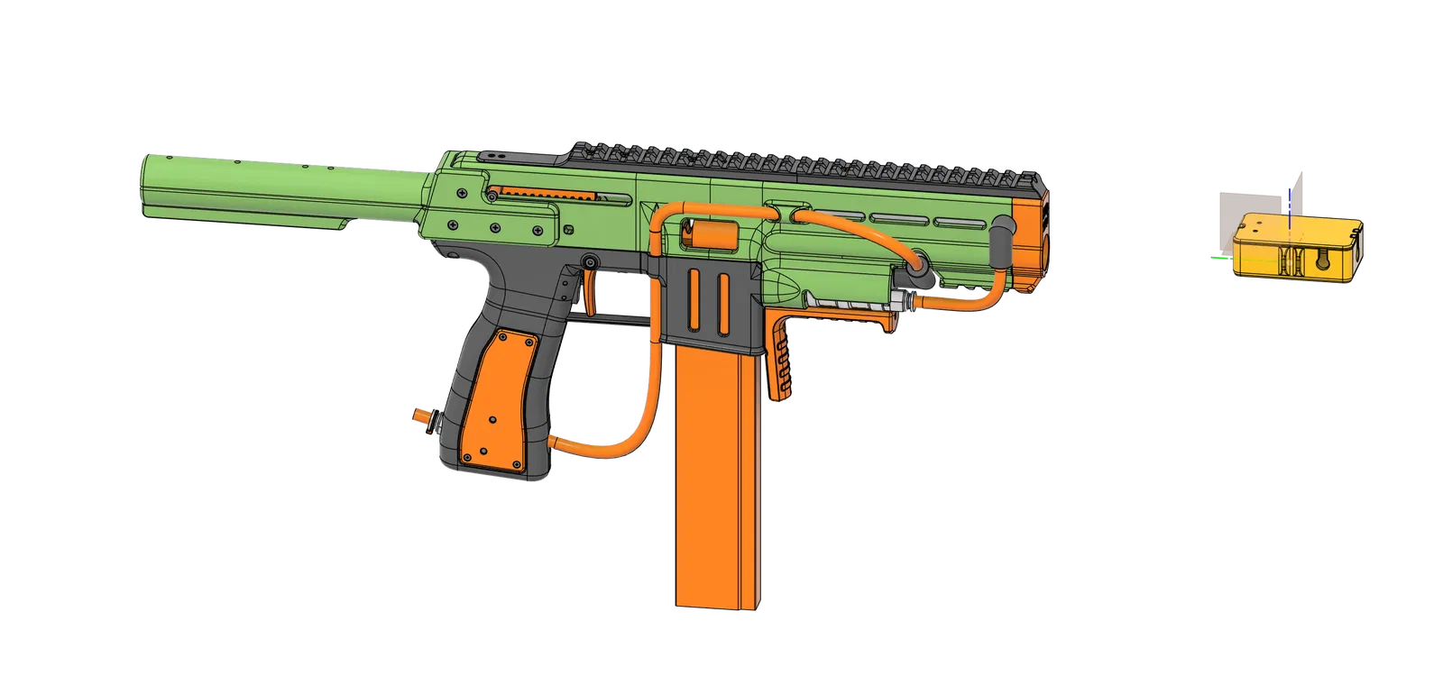Với kiểu đó, chỉ cần nối pin, solenoid valve, và trigger switch thành một vòng kín. Khi bạn bóp cò, solenoid valve tắt và bắn dart. Khi bạn nhả cò, solenoid valve bật lại, và nạp áp lại cho HPA core và pneumatic cylinder để vận hành ram/bolt.