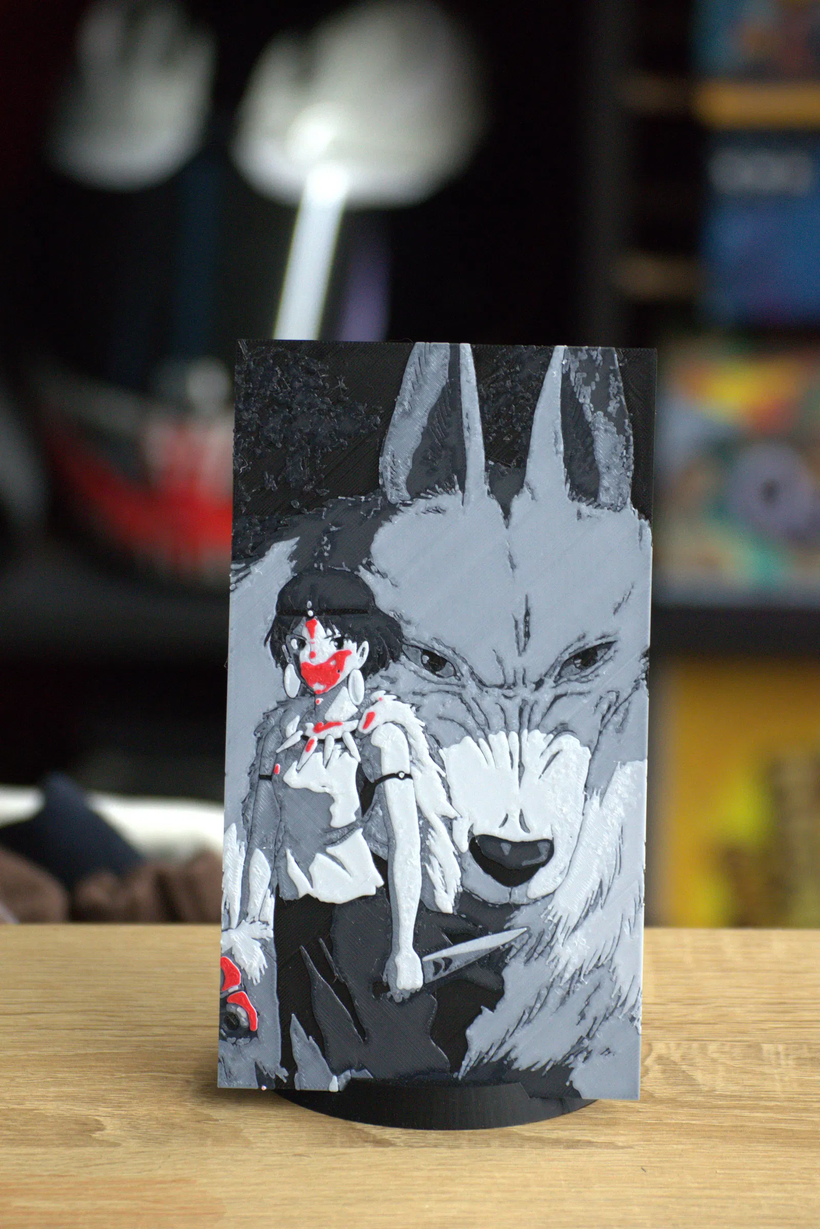 Bản remake lại một cover biểu tượng của Princess Mononoke bằng HueForge. File được thiết kế in multicolor theo kiểu swap filament theo layer, kèm thông số layer height, độ dày và thứ tự đổi màu rõ ràng.