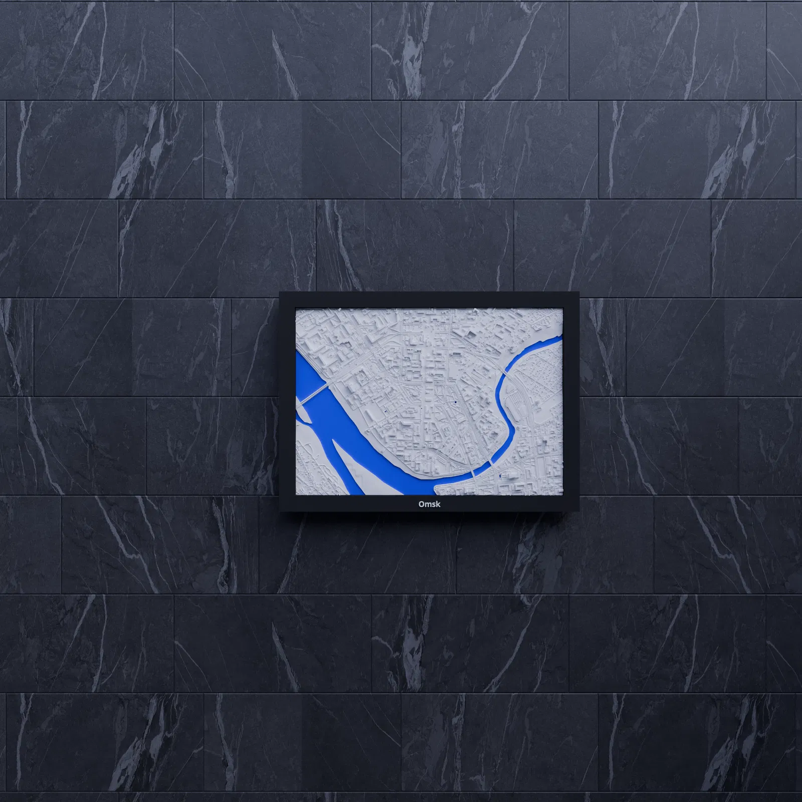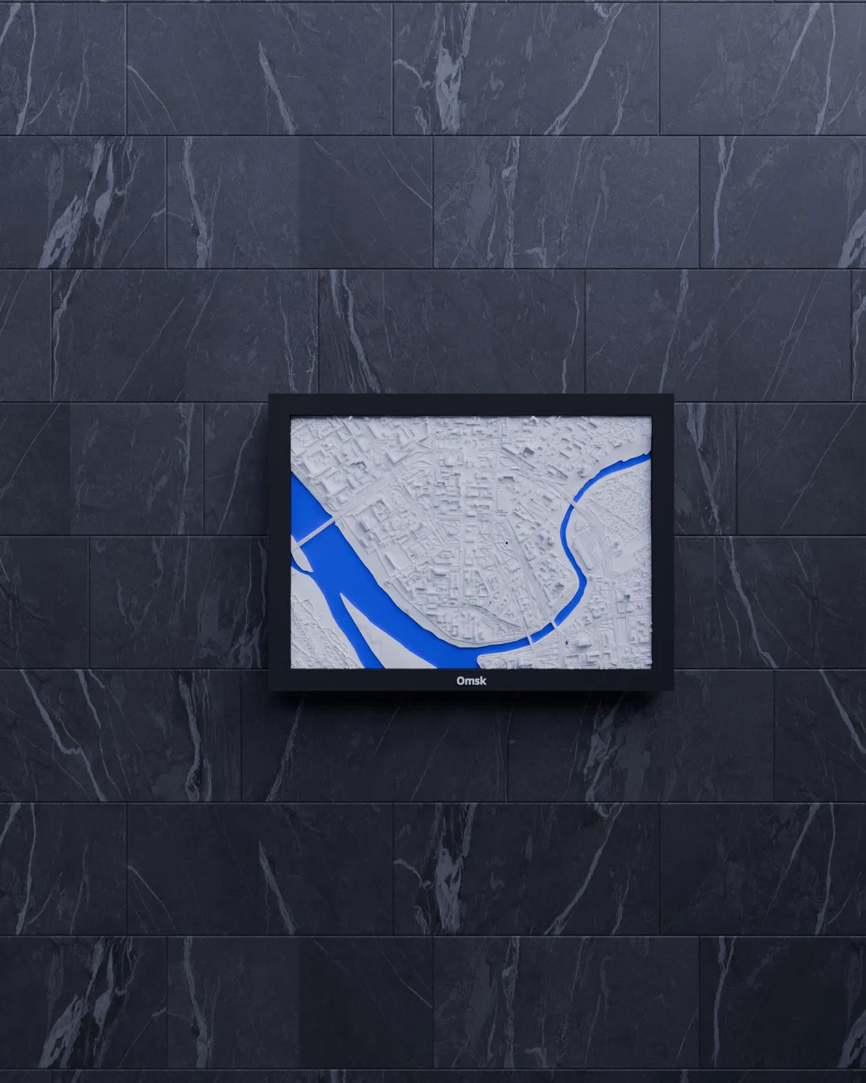 Mô hình thu nhỏ địa hình 3D của Omsk (Nga), dựng từ dữ liệu địa lý thực. Thu nhỏ khu vực 2.820 x 1.972 km xuống 170.5 x 119.5 mm, kèm nhiều lựa chọn frame có lỗ treo, phù hợp trưng bày hoặc học tập.