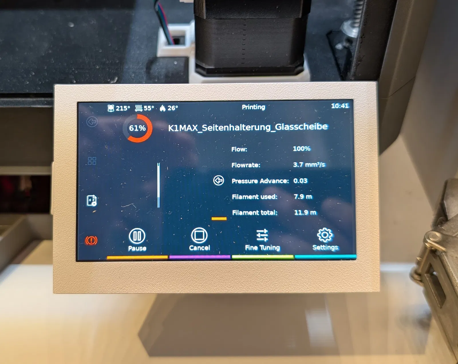 Ngàm/holder gắn BTT TFT43 vào đúng vị trí nguyên bản trên K1 (MAX), tận dụng lỗ bắt zin. Thiết kế in không cần support, không cần heat inserts; chỉ việc bắt holder vào điểm gắn và đặt frame phủ lên TFT.
