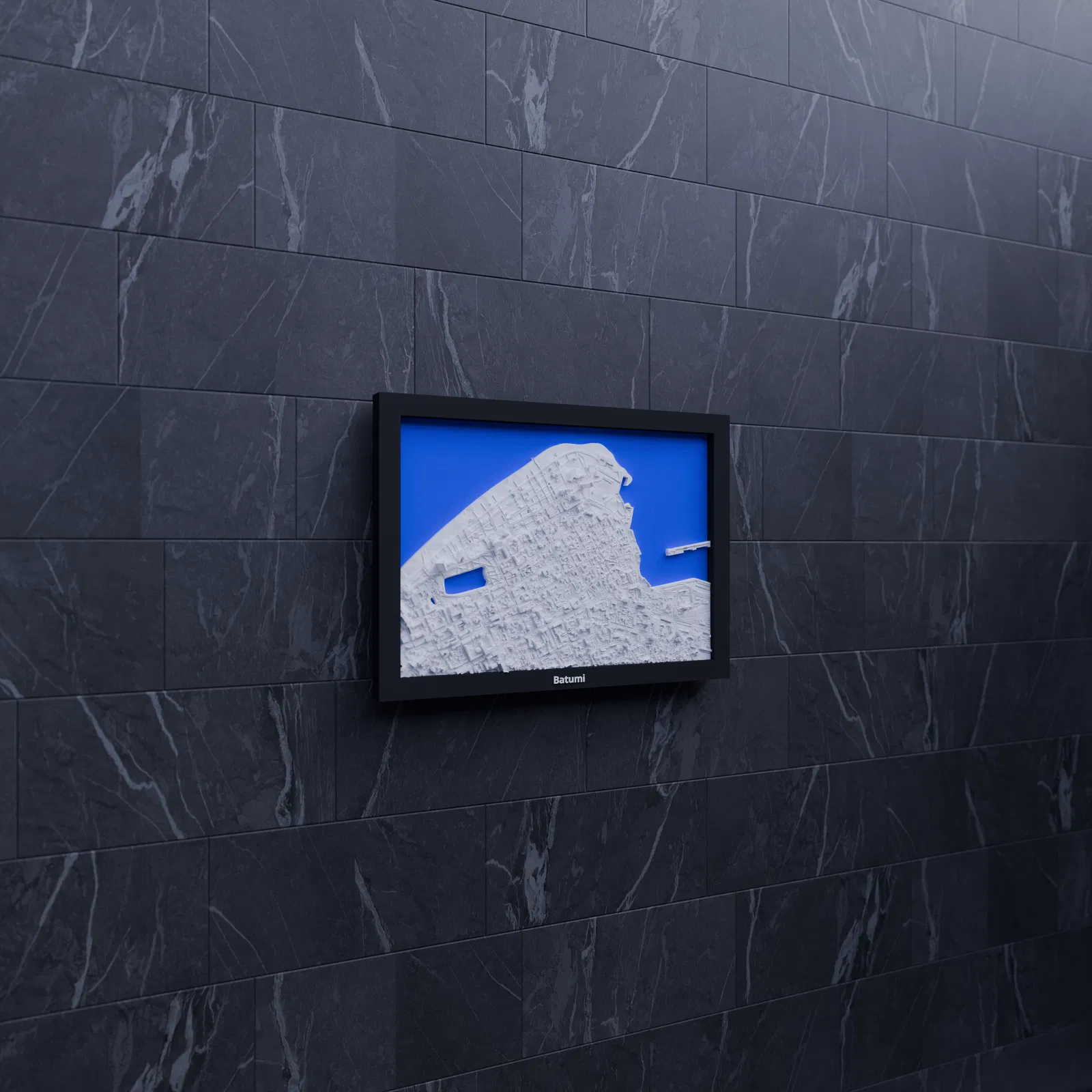 Bản thu nhỏ địa hình Batumi (Georgia) dựng từ dữ liệu địa lý, thu nhỏ khu vực 2.818 km x 1.967 km về kích thước 170.5 x 119.5 mm. Có nhiều frame kèm lỗ treo, phù hợp decor, học tập hoặc trưng bày.
