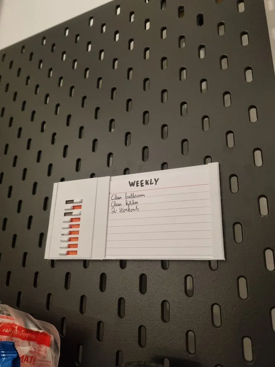 Tôi thích danh sách việc cần làm bằng giấy và đôi khi tôi cũng sử dụng chúng cho các nhiệm vụ lặp lại (ví dụ: công việc hàng tuần). Thay vì lãng phí giấy, tôi quyết định làm cái này thay thế. Nó dành cho thẻ ghi nhớ/ghi chép A7 (105x74mm) mà tôi đã có và các thanh trượt được thiết kế để căn chỉnh với từng dòng.