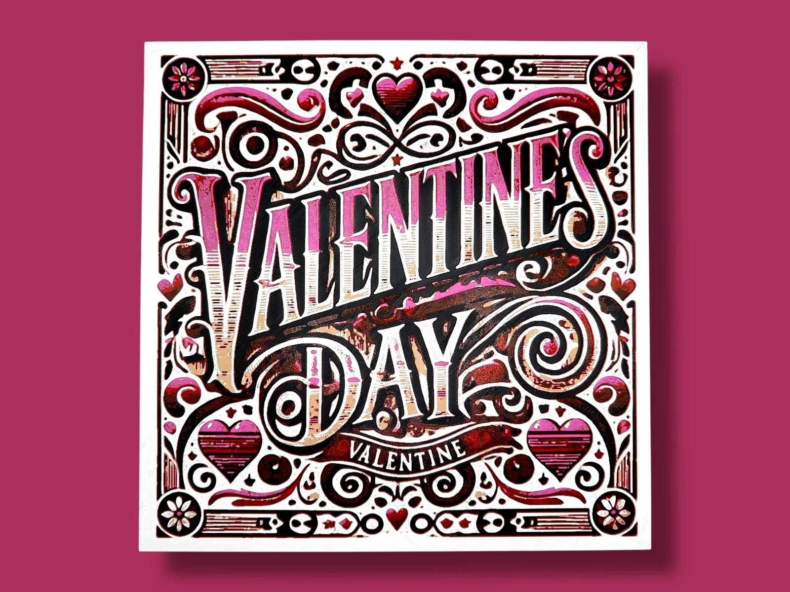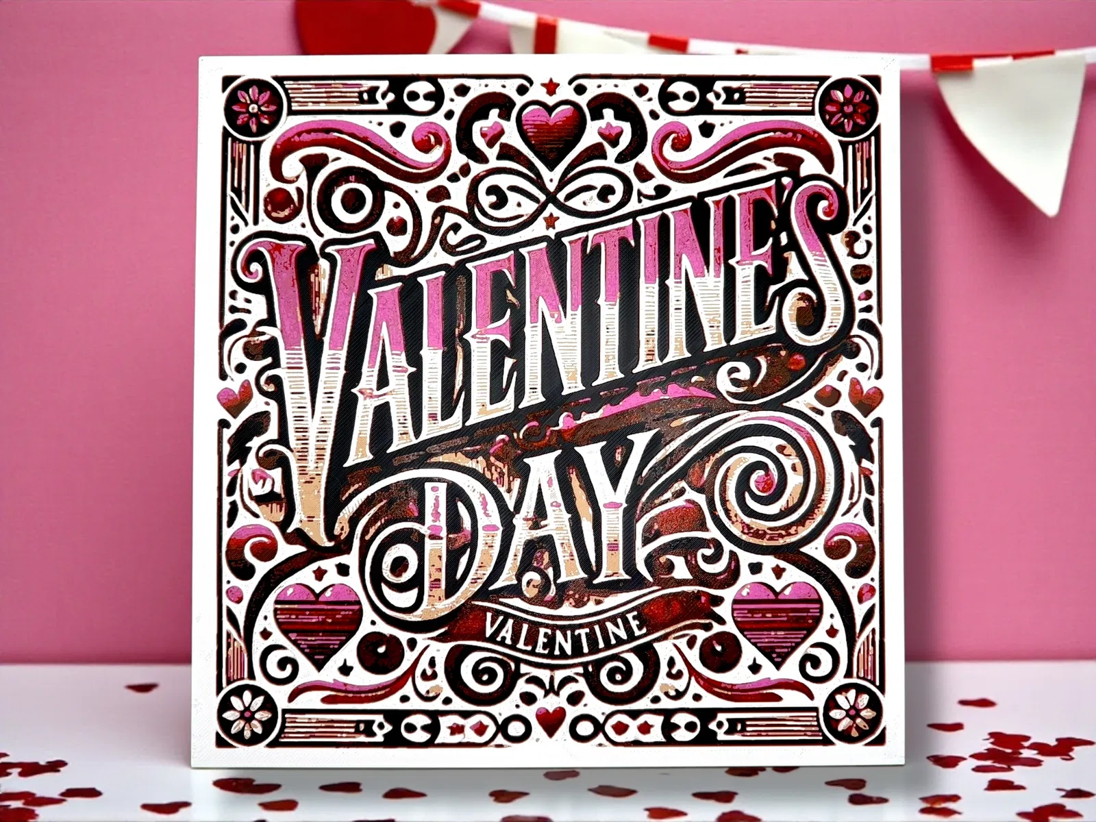Thiết kế Hueforge chủ đề Valentine’s Day với typography vintage đậm nét trong khung trang trí cầu kỳ. Tông hồng–đỏ ấm áp, tương phản cao, hợp trang trí theo mùa hoặc trưng bày quà tặng, in 200×200mm.