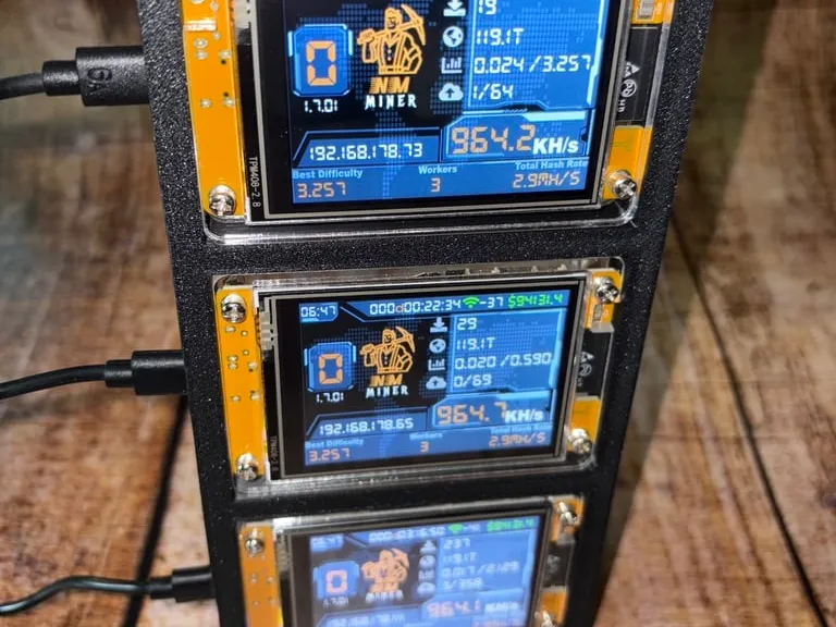 Stand để bàn cho 3 Nerdminer, giúp sắp xếp mấy lottery miner nhỏ gọn gàng trên bàn làm việc hoặc dưới TV. Thiết kế nhìn sạch sẽ và thường khiến người khác tò mò, dễ bắt chuyện về crypto/nerdminer.