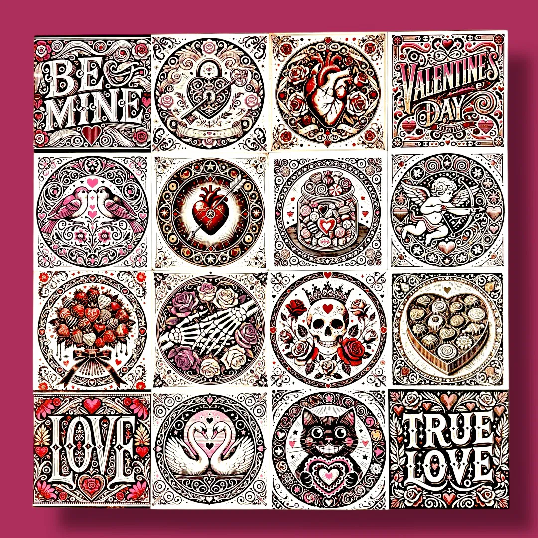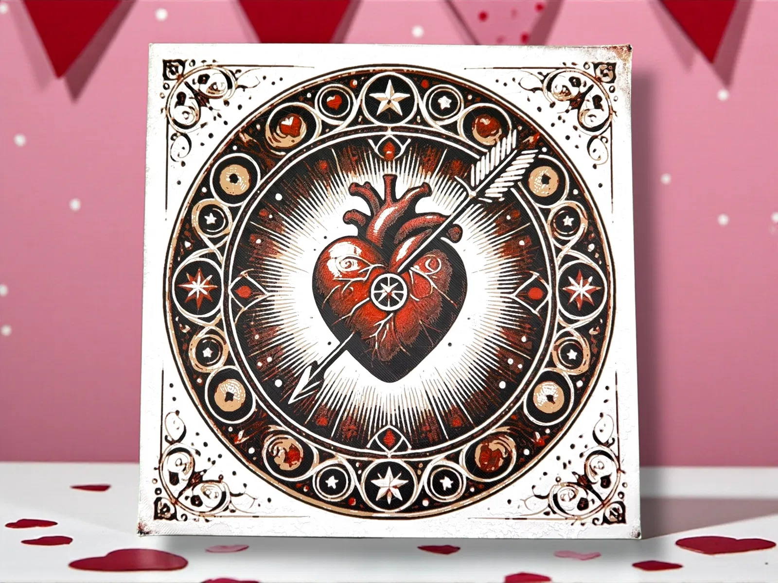 Tác phẩm dạng vuông nổi bật này khắc hoạ một biểu tượng mạnh mẽ của sự tận tâm và mãnh liệt: một trái tim giải phẫu chi tiết ở trung tâm, bị xuyên bởi mũi tên kinh điển. Thiết kế toả năng lượng, được bao quanh bởi một vòng vũ trụ gồm sao, trái tim và các hoạ tiết mặt trăng. Với tông đỏ đậm, nâu trầm và trắng ngà, phong cách linocut táo bạo gợi cảm giác tình yêu thiêng liêng và sự kỳ diệu của trời sao. Rất hợp cho thông điệp Valentine pha chút hoài cổ và huyền bí—lý tưởng để trang trí Valentine kiểu “alternative”.