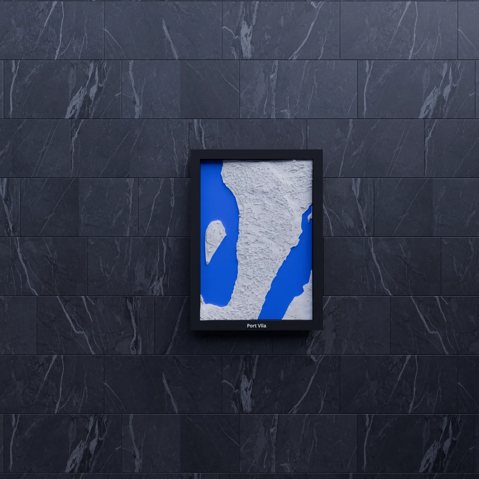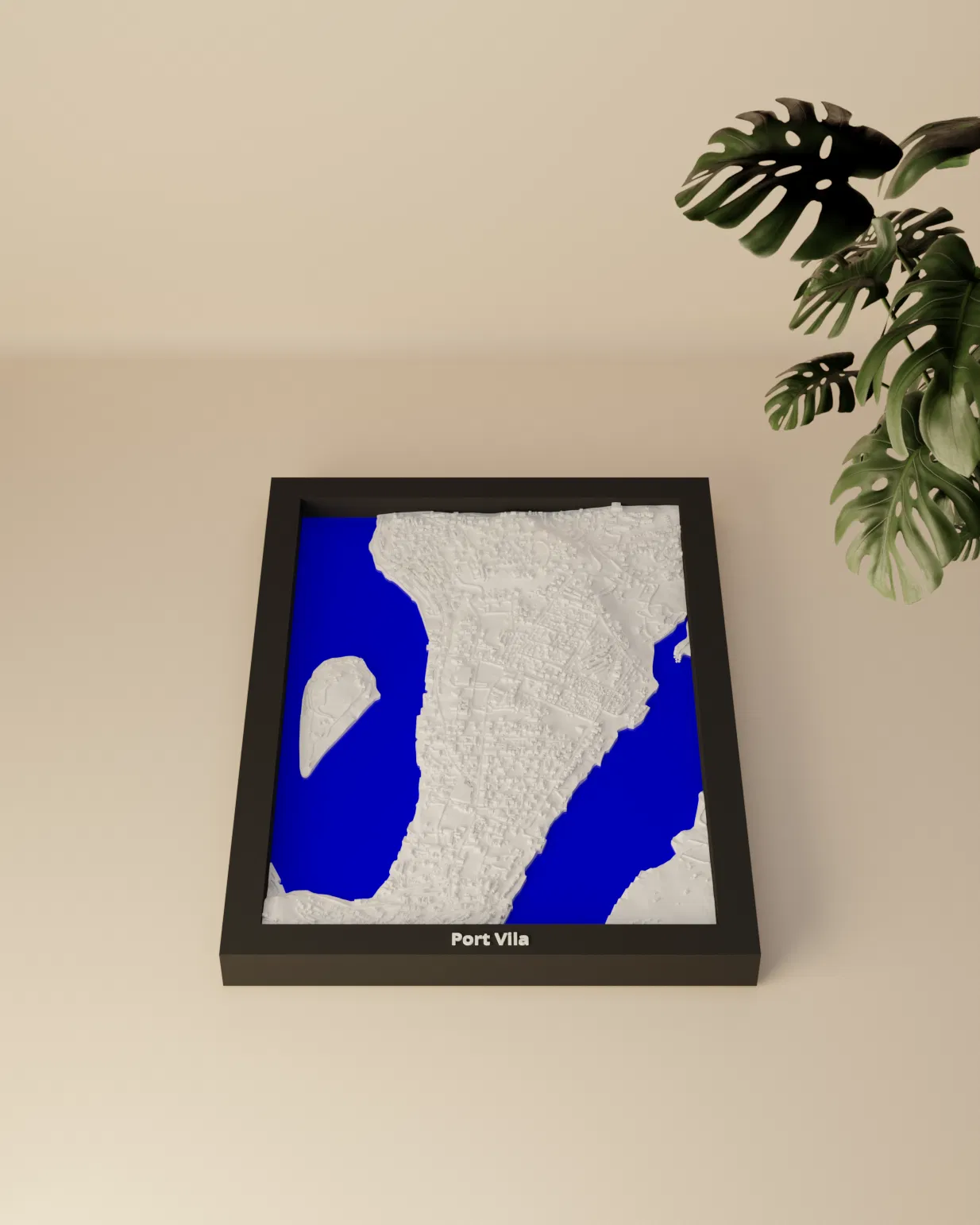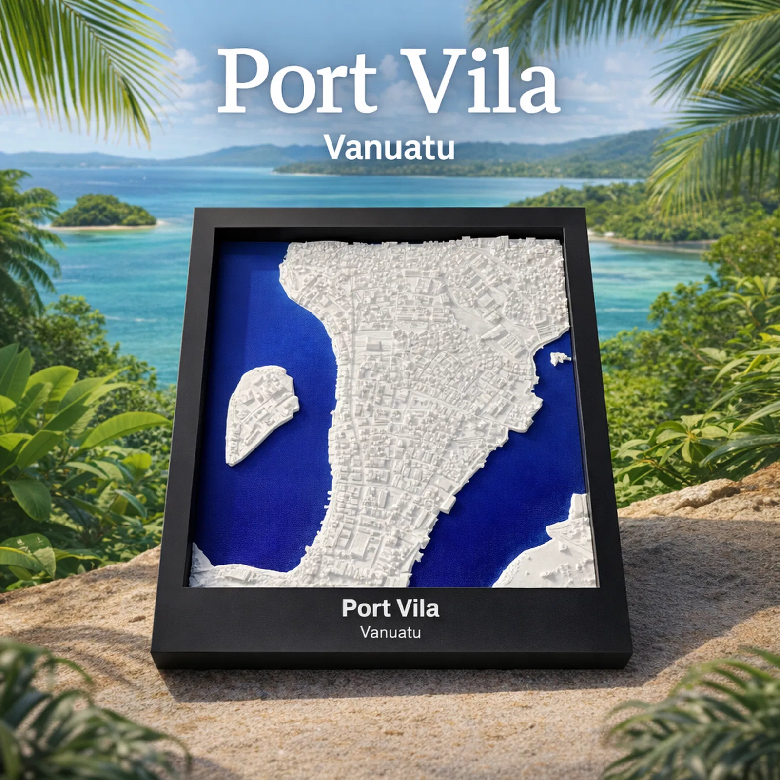 Mô hình thu nhỏ địa hình Port Vila (Vanuatu) dựng từ dữ liệu địa lý, tỉ lệ khoảng ~16503:1. Kích thước in 119.5 × 170.5 mm, có frame kèm lỗ treo. Phù hợp trưng bày, học tập hoặc làm quà.