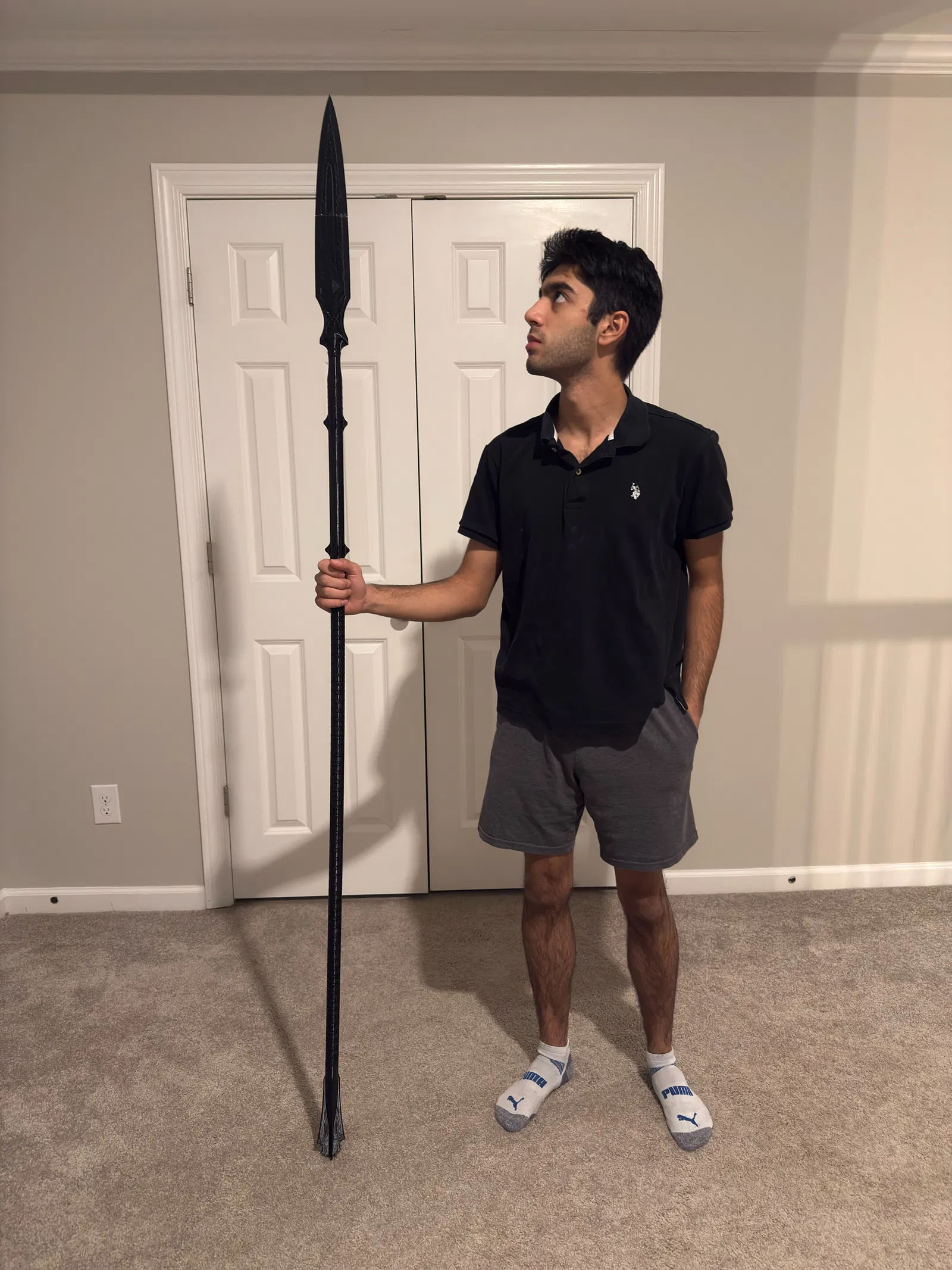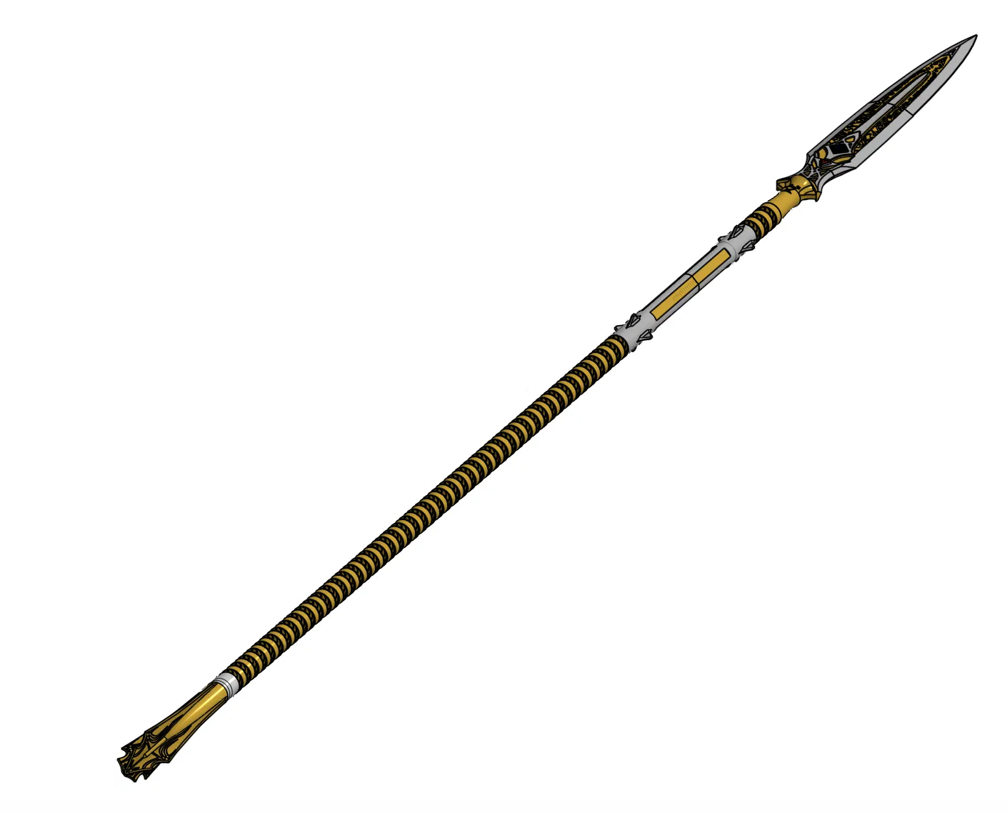 Mẫu God of War Draupnir Spear (giáo của Kratos trong God of War Ragnarock). Các phần thân có ren vặn nối nên không cần thanh nhôm; mũi giáo dán keo PVA/3D gloop. In PLA, infill 15%, tất cả part cần support và nên dùng brim.