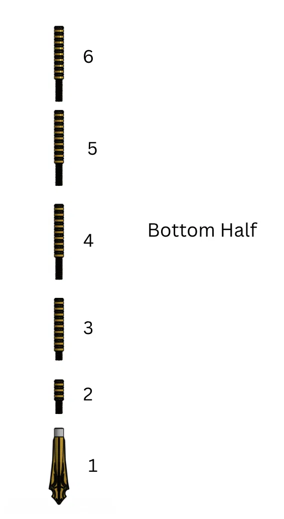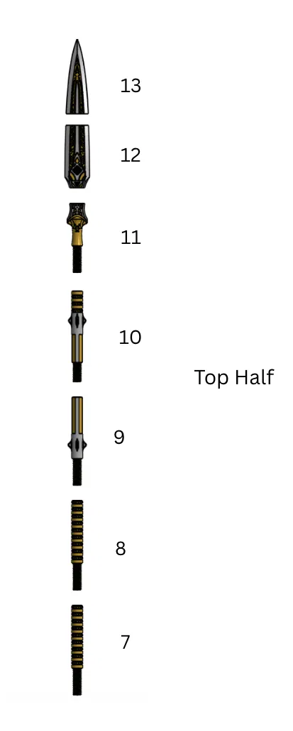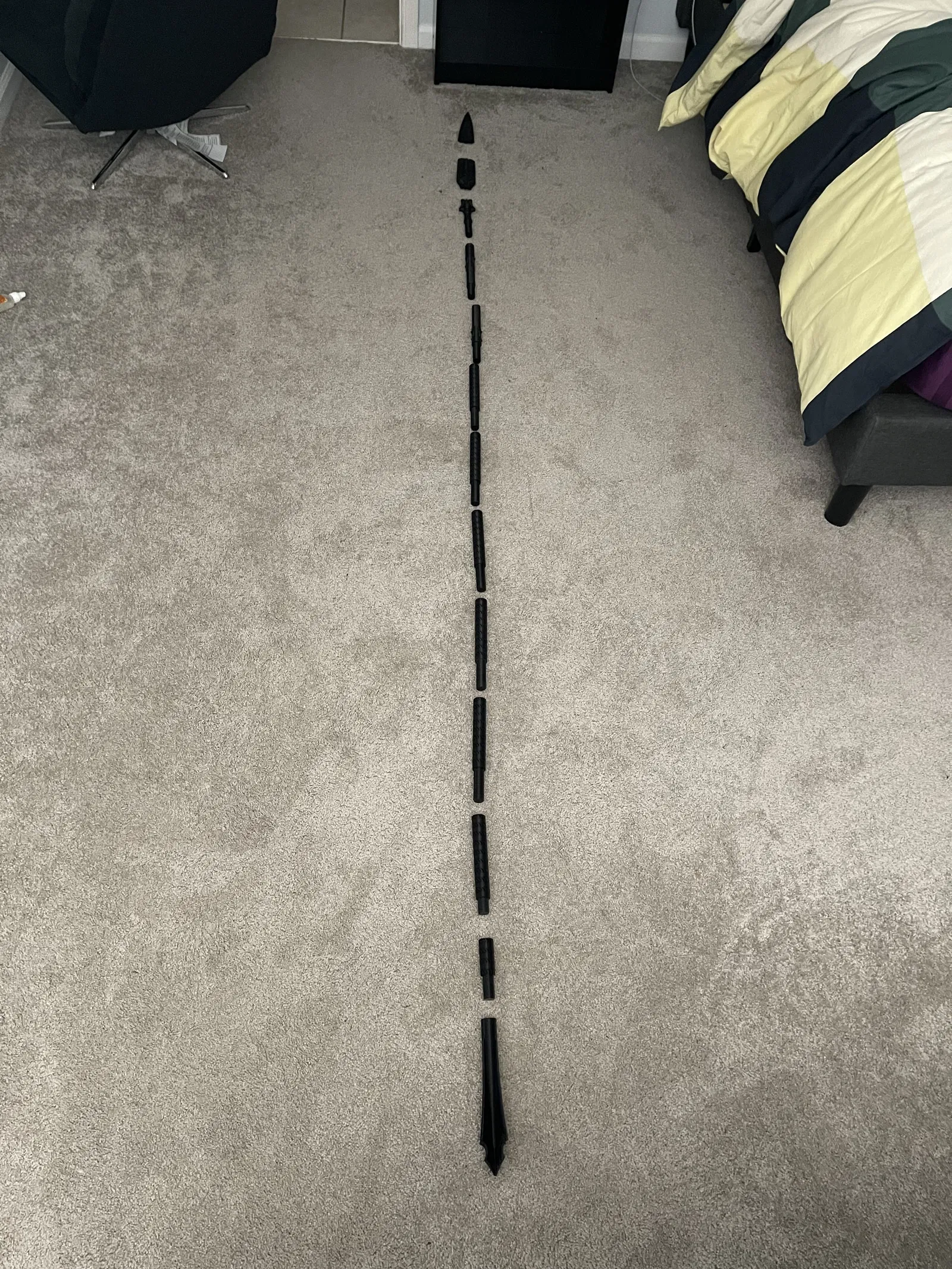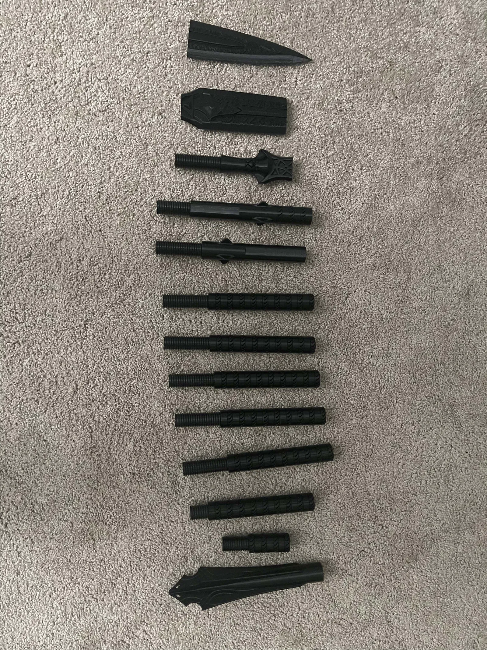 Tất cả các phần của cây giáo này, trừ phần mũi giáo, đều có ren để vặn nối, nên bạn không cần dùng thanh nhôm. Riêng phần mũi giáo, mình chỉ dùng keo PVA để dán và thấy khá ổn, nhưng bạn có thể dùng 3D gloop nếu muốn liên kết chắc hơn. Mình vẫn đang làm khâu sơn cây giáo.