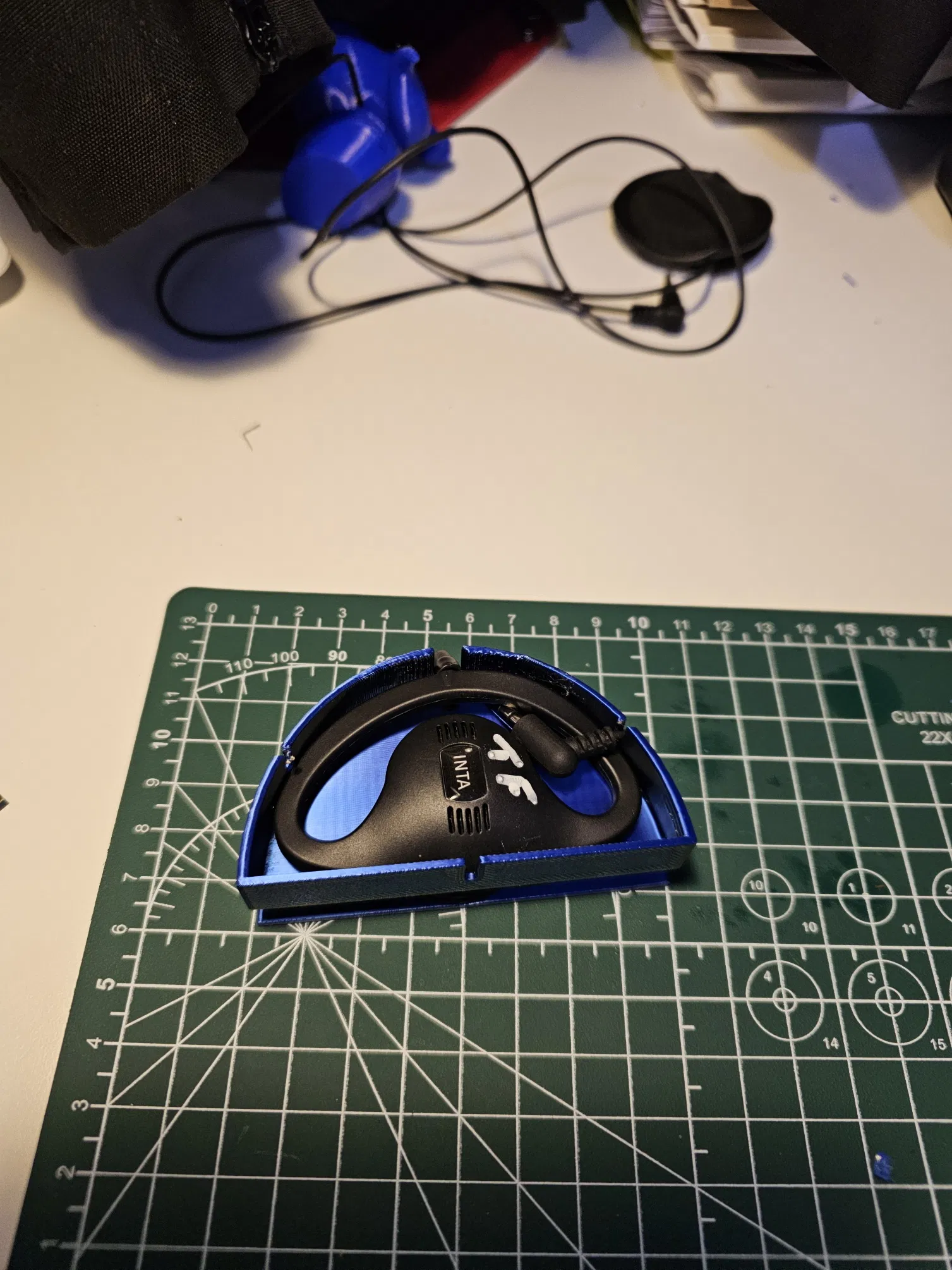 Thiết kế do mình tự làm để giữ earpiece mono gọn gàng, không bị rối dây—đặc biệt hữu ích khi dùng lúc hướng dẫn lái mô tô. Sau nhiều lần thử nghiệm, bản hiện tại giữ được 1 earpiece; dự tính sẽ thêm phần sau để kẹp 2 earpiece.